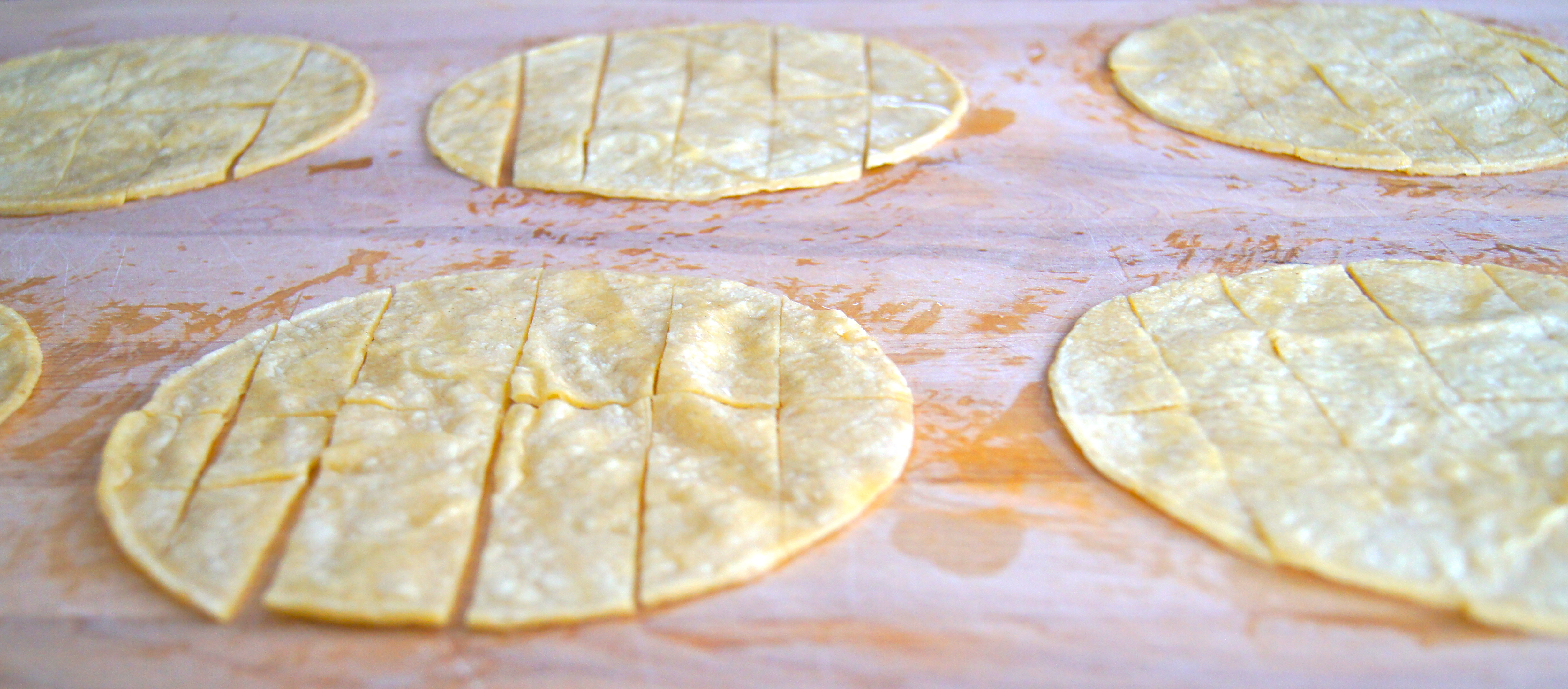 While soup is simmering on the stove, prepare your tortillas for topping.  Lay out tortillas on a cutting board and brush both sides with peanut oil.  Slice tortillas into strips, place strips on baking sheet and bake for 10-12 minutes, or until they are crisp and golden.  Heres what they will look like after you cut them and before you place them on the cookie sheet