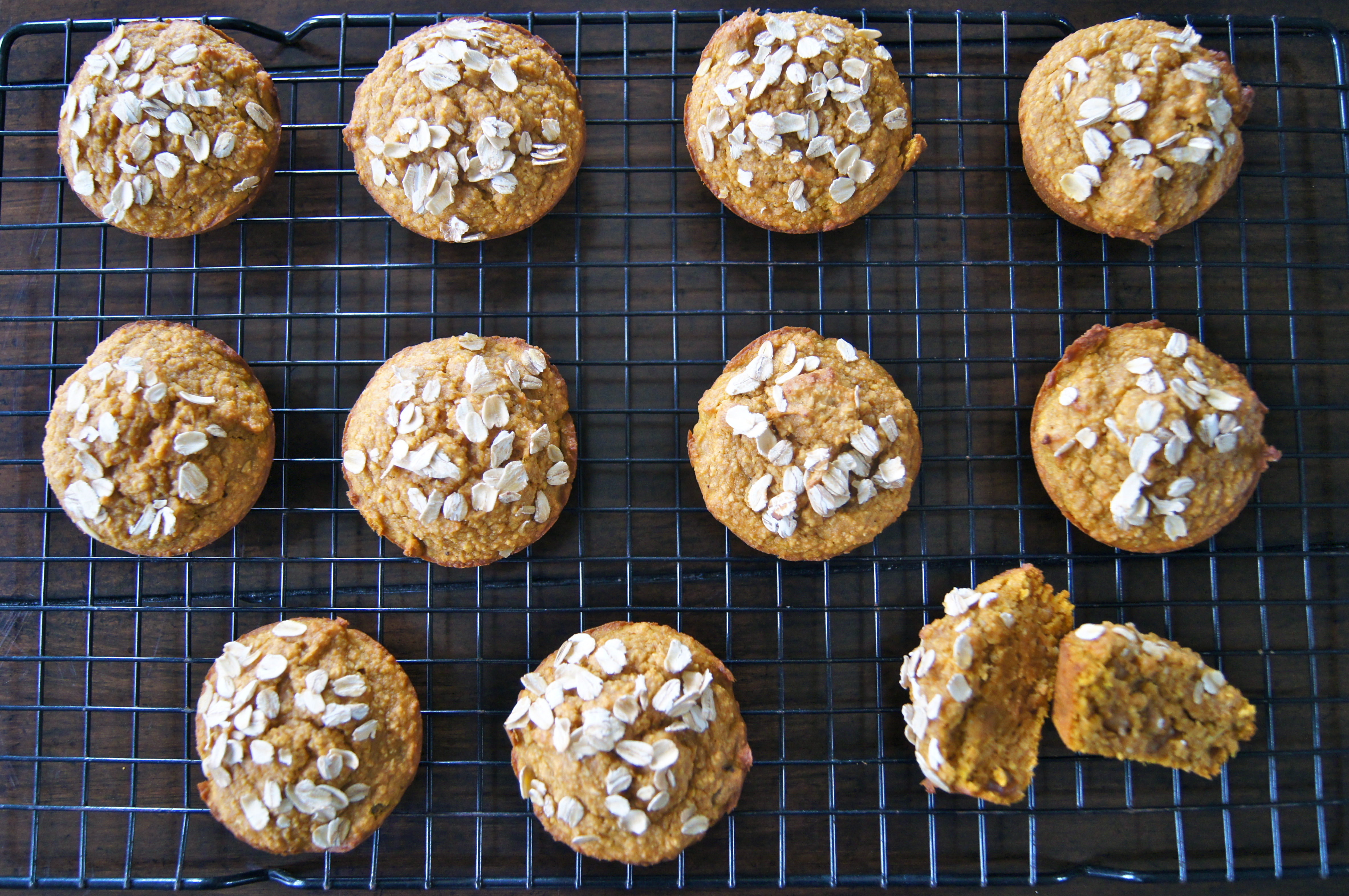 Combine oat flour, baking powder, salt, nutmeg, ginger and cinnamon in a medium bowl. In a separate large bowl whisk together pumpkin, butter or coconut oil, eggs, agave or honey and maple syrup. Stir dry ingredients into wet and mix with a spoon until combined. Stir in walnuts and distribute batter amongst the muffin pan cups and sprinkle the top of the muffins with oats. Bake until toothpick comes out clean, 20-25 minutes.