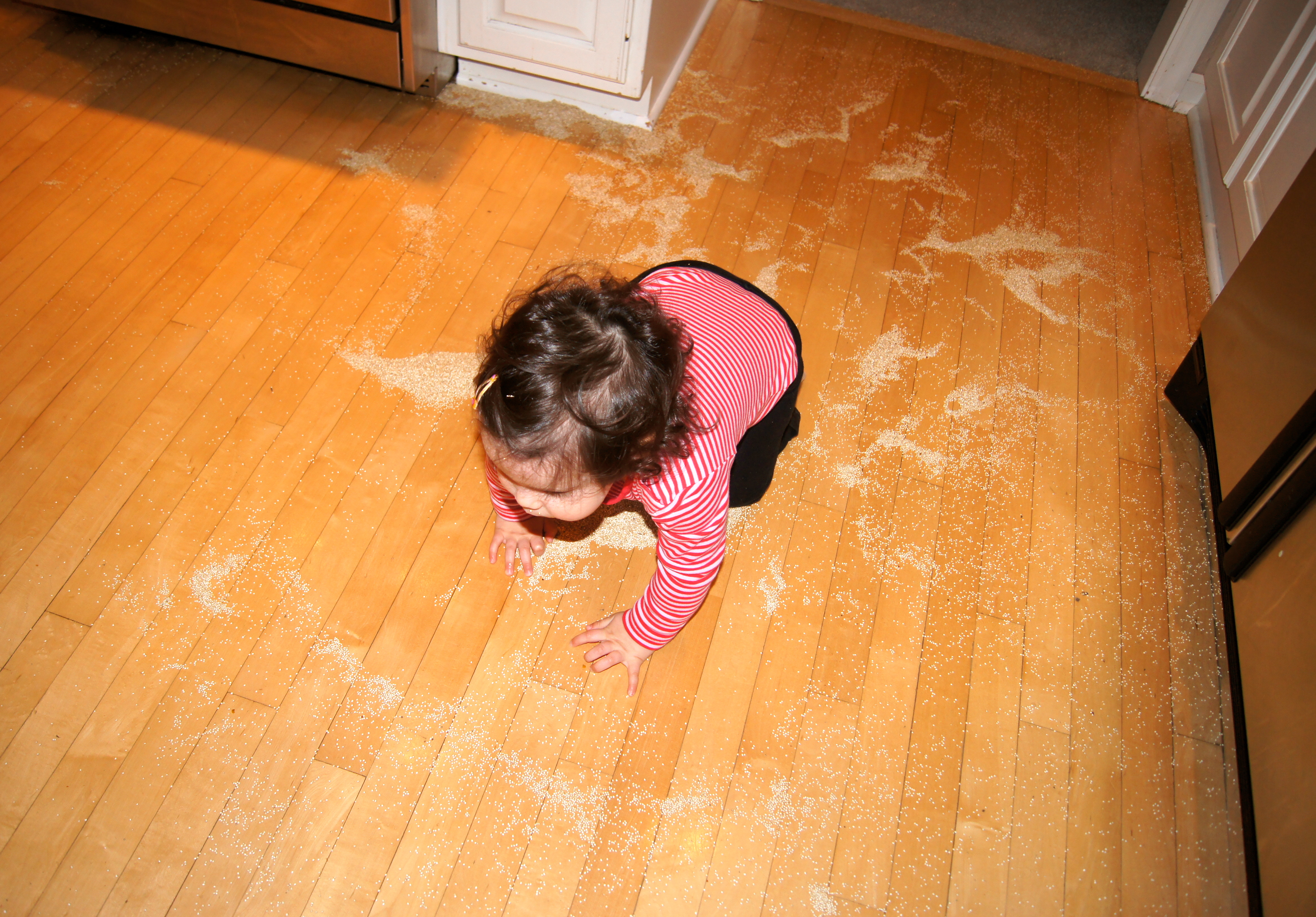 In case you are wondering, I have not turned my kitchen floor into a sandbox. Somebody, who shall remain nameless, got into a HUGE bag of quinoa. I swear the kid is as quick as lightning. One minute she’s stacking all of the Tupperware and building a castle like a sweet, innocent little princess. And the next thing you know I turn around and she is laughing and rolling around in an obscene amount of quinoa like she has just hit the damn jackpot. Needless to say this set me back a bit…because of course once she saw the look on my face she went running and tracked the quinoa through the entire house. Perfect.