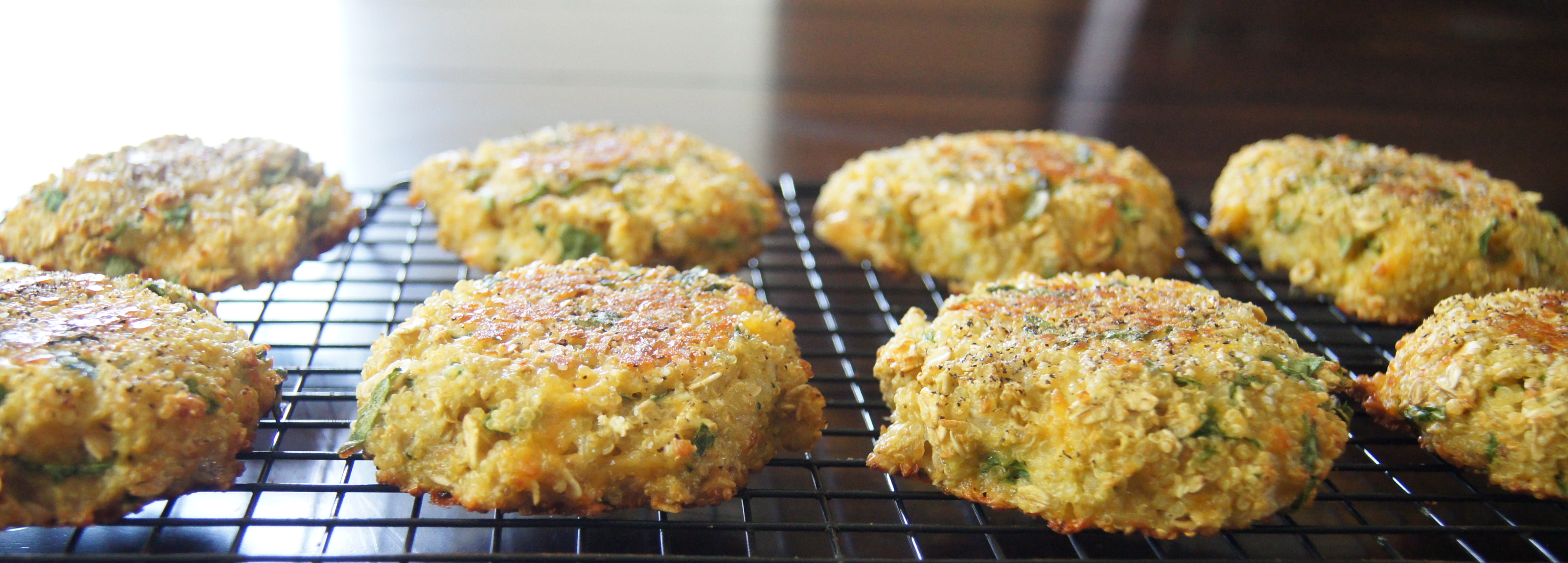 About a year ago I had some leftover cooked quinoa in the fridge so I decided to throw a bunch of ingredients with it and fry them on the stove into “cakes”. I typically do this with leftover rice so thought I would give it a try. The taste was shockingly good but the texture wasn’t perfect, they fell apart on me while cooking them. After a few other attempts and some changes in the ingredients and process they are just what i was hoping for. Nutty, cheesy, crunchy on the outside gooey on the inside wonderfulness. They contain an insane amount of protein, magnesium, iron, fiber and vitamins and are the perfect meal in one little cake. Your kids will love them dipped in anything…we prefer a dolop of sour cream and salsa right on top.