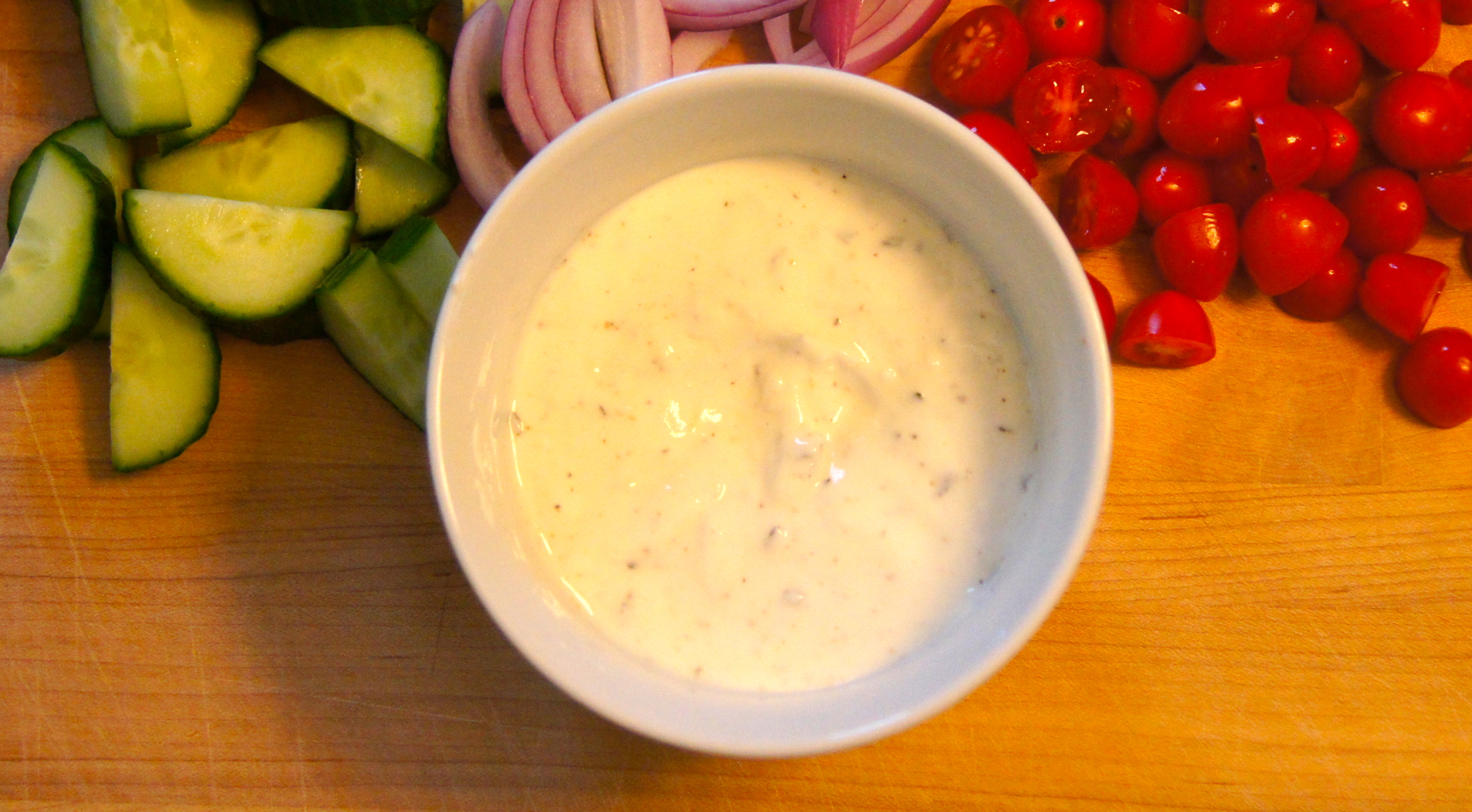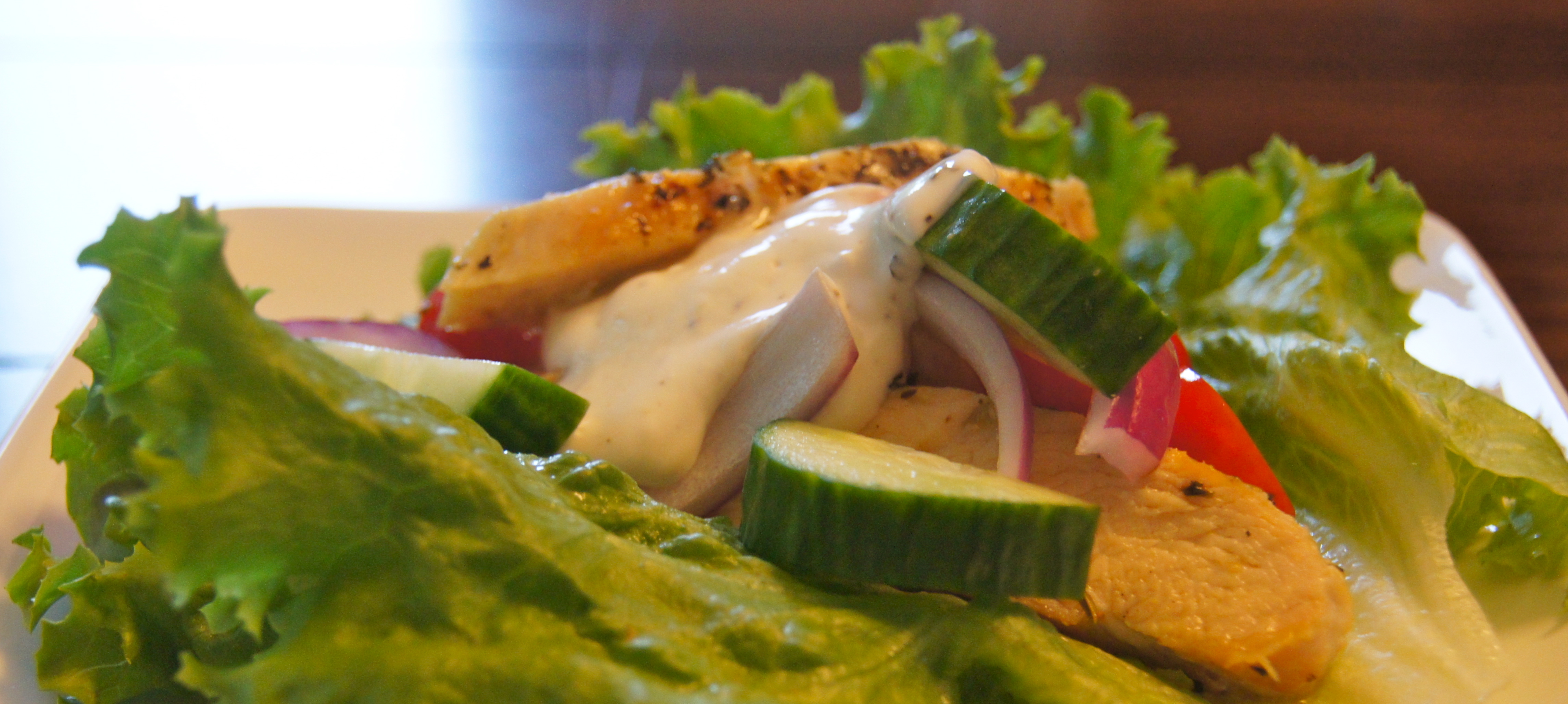 Slice the chicken while it is still in the pan and stir the slices around to coat them in all of the pan juices.  Serve chicken on top of lettuce leafs and top with a spoonful of the yogurt sauce, cucumber, tomato and onion, if desired.