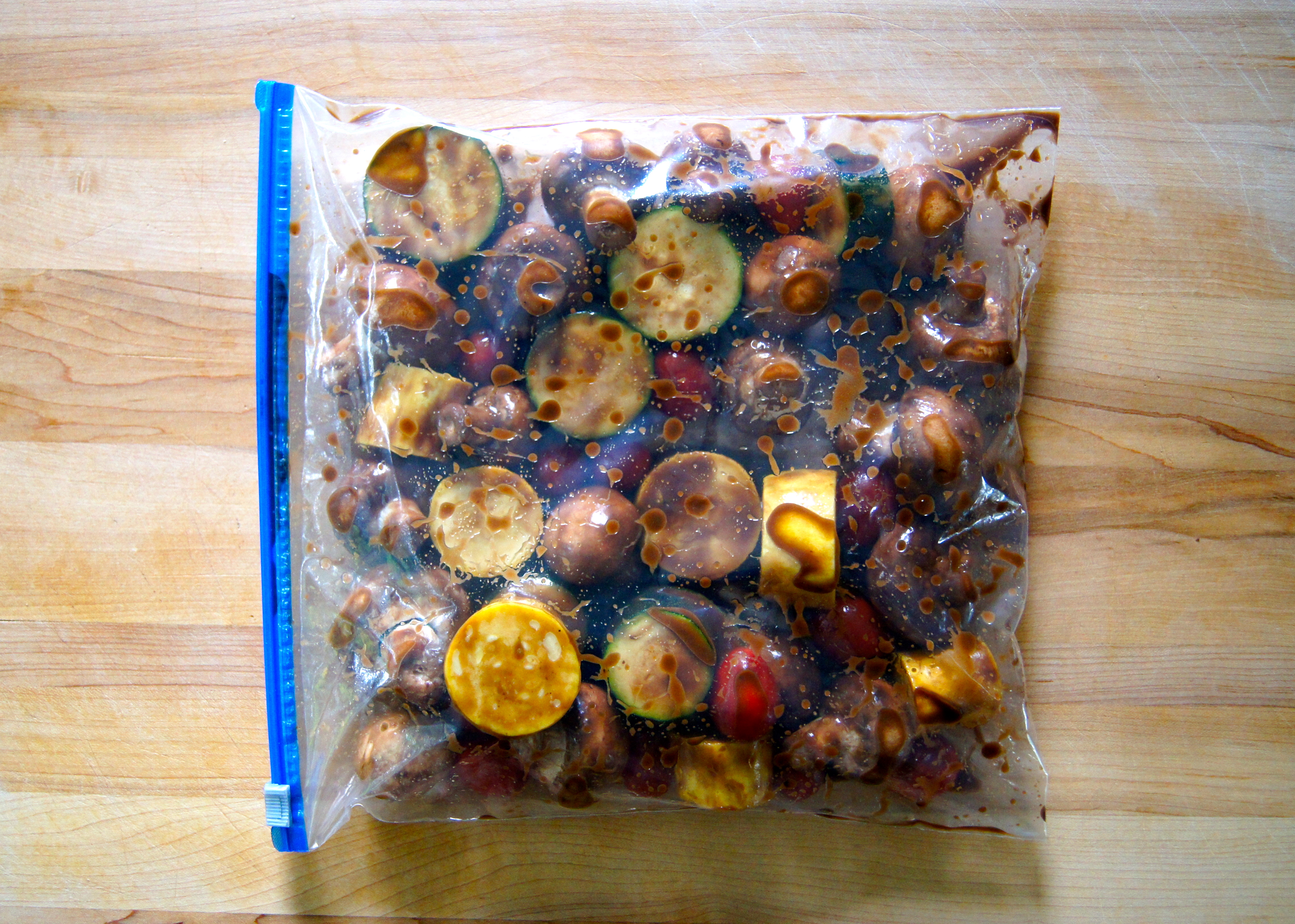 In a small bowl whisk together olive oil, balsamic vinegar, dijon, salt and pepper. Add zucchini, squash, tomatoes and mushrooms to a large zip-top bag. Pour balsamic marinade over the veggies, seal the bag and toss to coat well. Refrigerate for at least one hour and up to 4 hours.