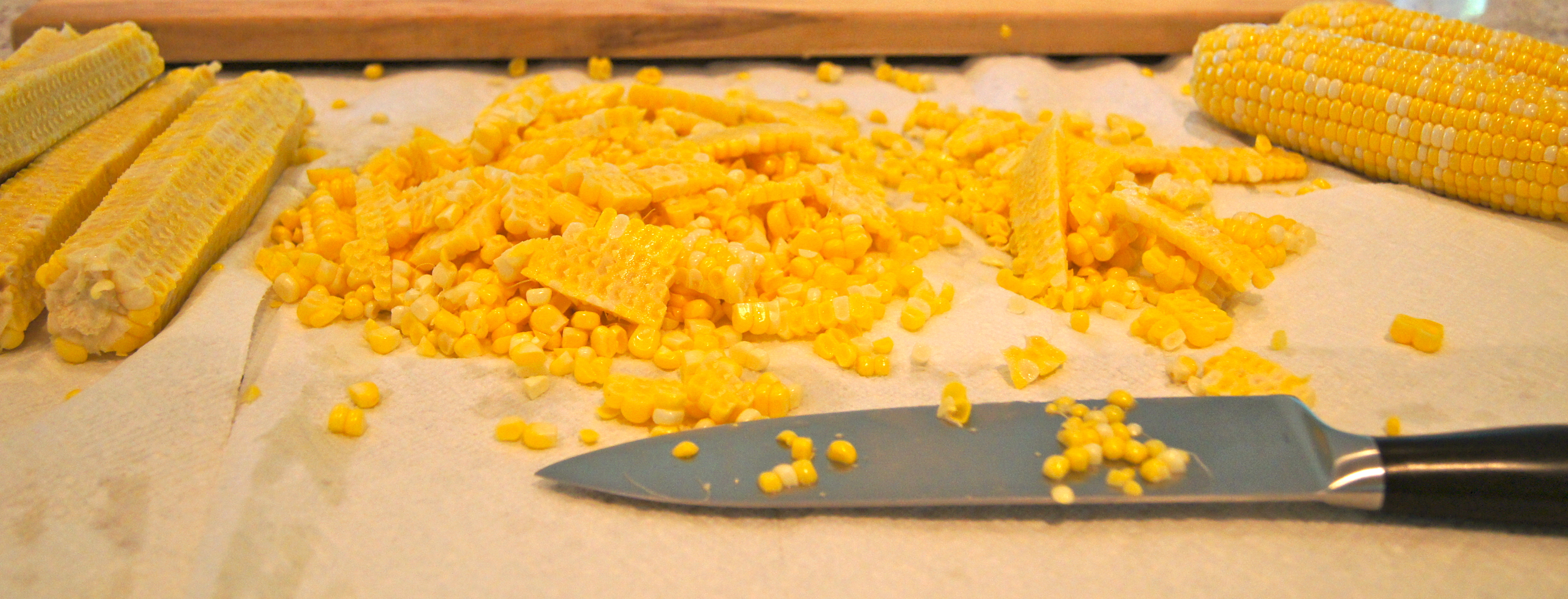 If you cut your kernels off the cobs on a kitchen towel or paper towel it will prevent the kernels from winding up all over your counter or the floor.