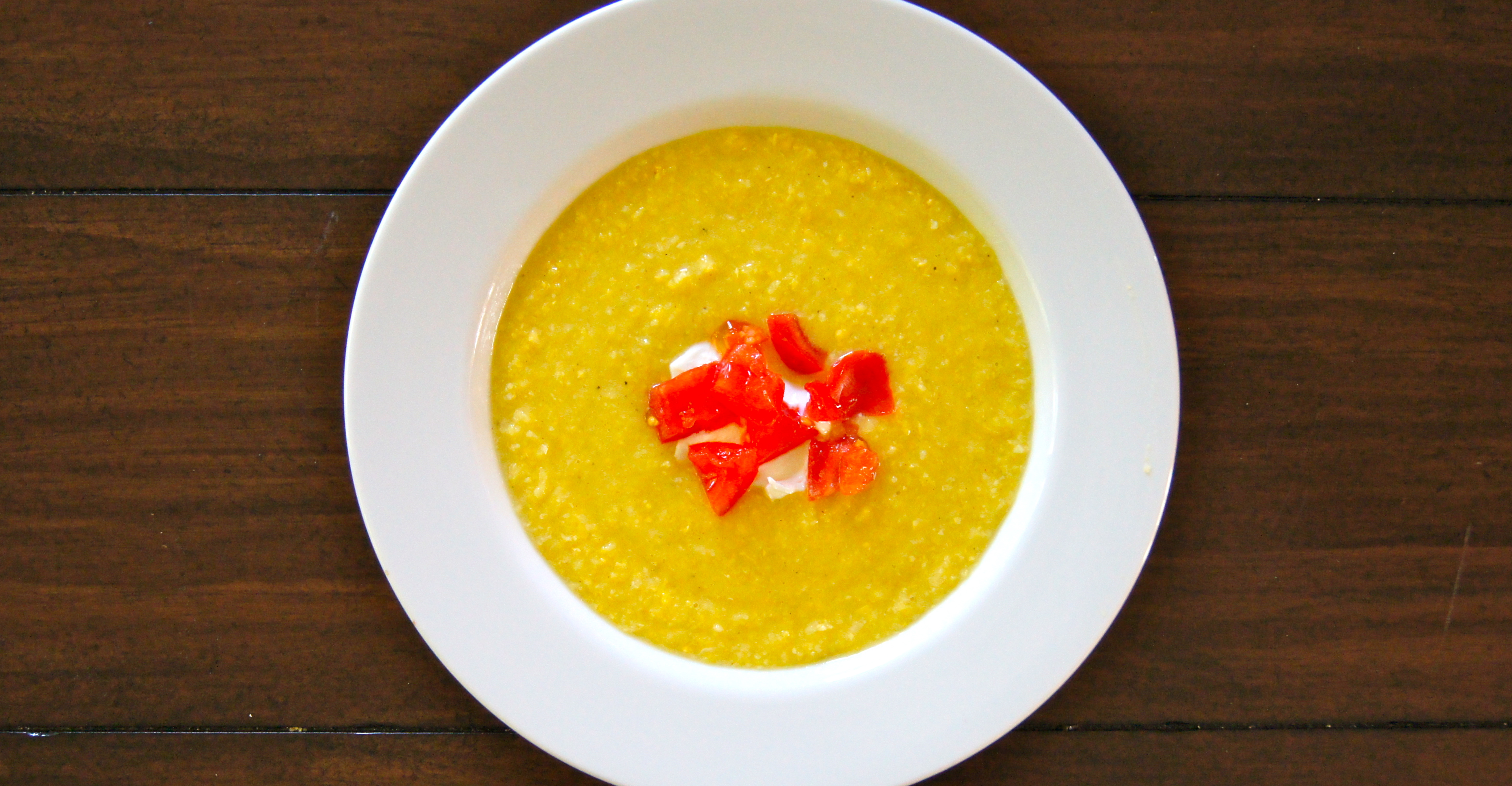 If using a food processor or blender return puree back to the pot, add the reserved pulp and milk from the cobs and simmer over medium heat for 10 minutes. Add salt and pepper to taste and serve with a garnishing of sour cream, diced tomatoes and crushed red pepper flakes. Serves 6.