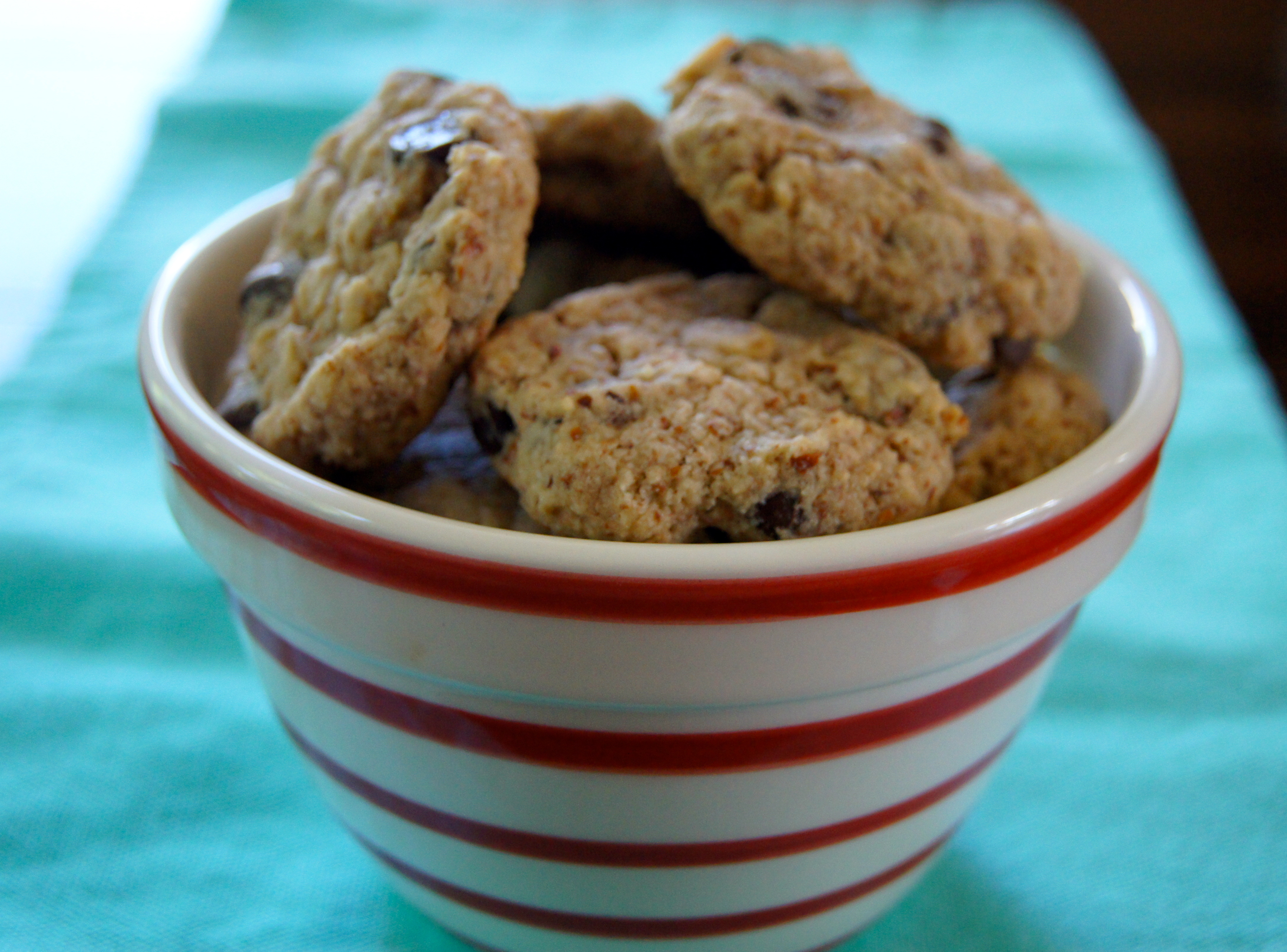 I have literally tried over 20 shots at a wheat free, refined sugar free chocolate chip cookie with very little success. They either come out too dry, too crumbly, too crispy, not sweet enough or just plain not good tasting. Having said that I am THRILLED to share this recipe with you as I think I FINALLY hit a home run, just yesterday (I think it was karma…the universe is feeling terribly sorry for me for all of that Sweet Martha torture I’ve been put thru). If you are looking for a soft, chewy, knock-your-socks-off chocolate chip cookie give these a try. You will be absolutely shocked at the flavor and texture that is able to be achieved without using refined flours or sugars. Now there is no crisp to these, they are simply chewy and soft which is right up my alley. Your kids will adore these…if you don’t manage to eat the entire batch before sharing.
