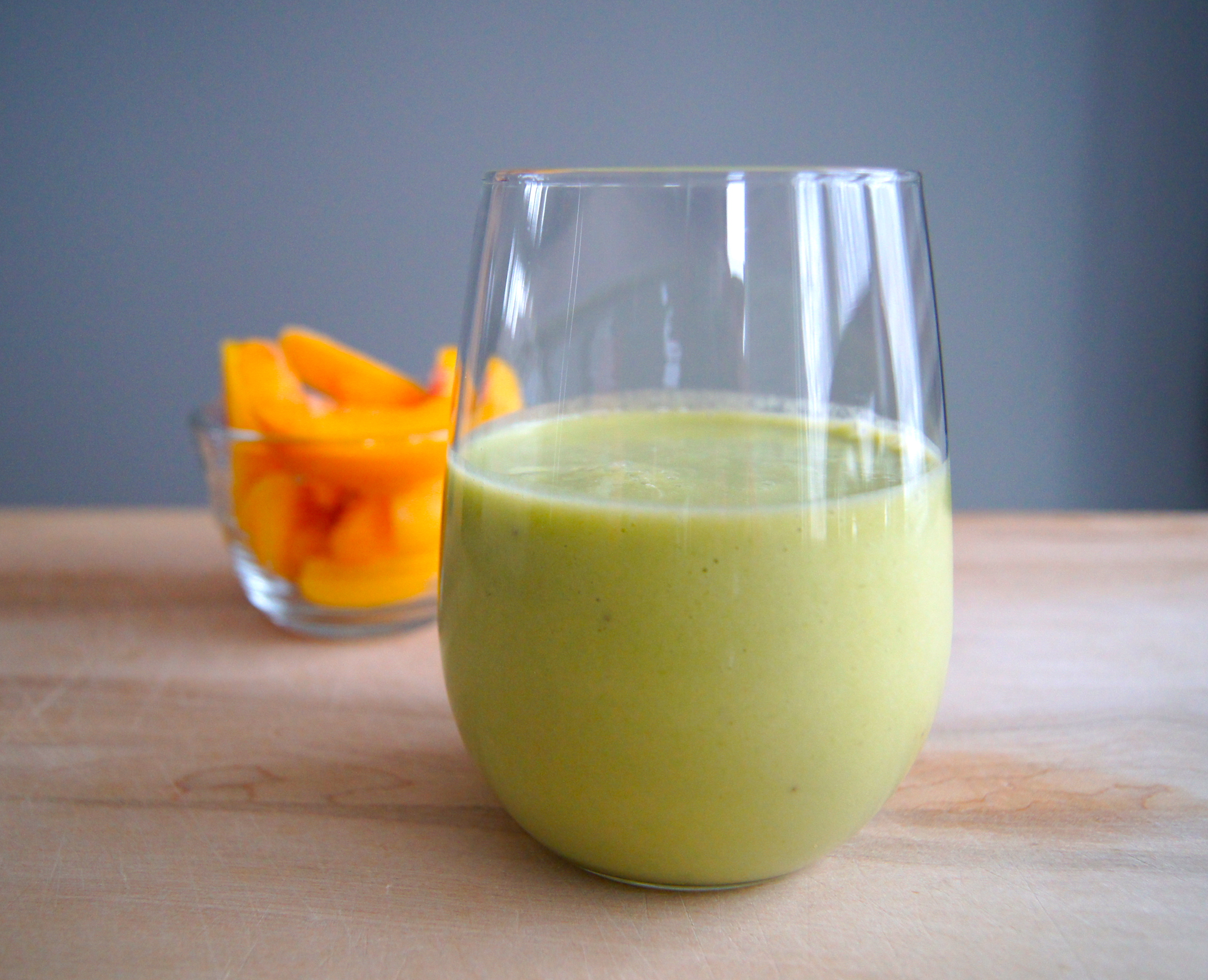 So, after telling you about our total debacle of an attempt to get out the door I need to tell you that these smoothies have saved me. I typically make them up either the night before or in the morning before the kids get up, store them in the fridge and they are all ready to go as we rush out the door. They are so incredibly simple and yummy…they’ve converted me to a smoothie lover. Through our week of testing out recipes I learned that I absolutely positively can not stand seeds in my smoothies so most berries were out. This recipe was the winner for both of us. The peaches and banana are an awesomely sweet combination, the spinach simply adds color and nutrients without effecting the taste and the coconut milk and yogurt provide healthy fats, protein and give it an amazingly smooth taste and texture.