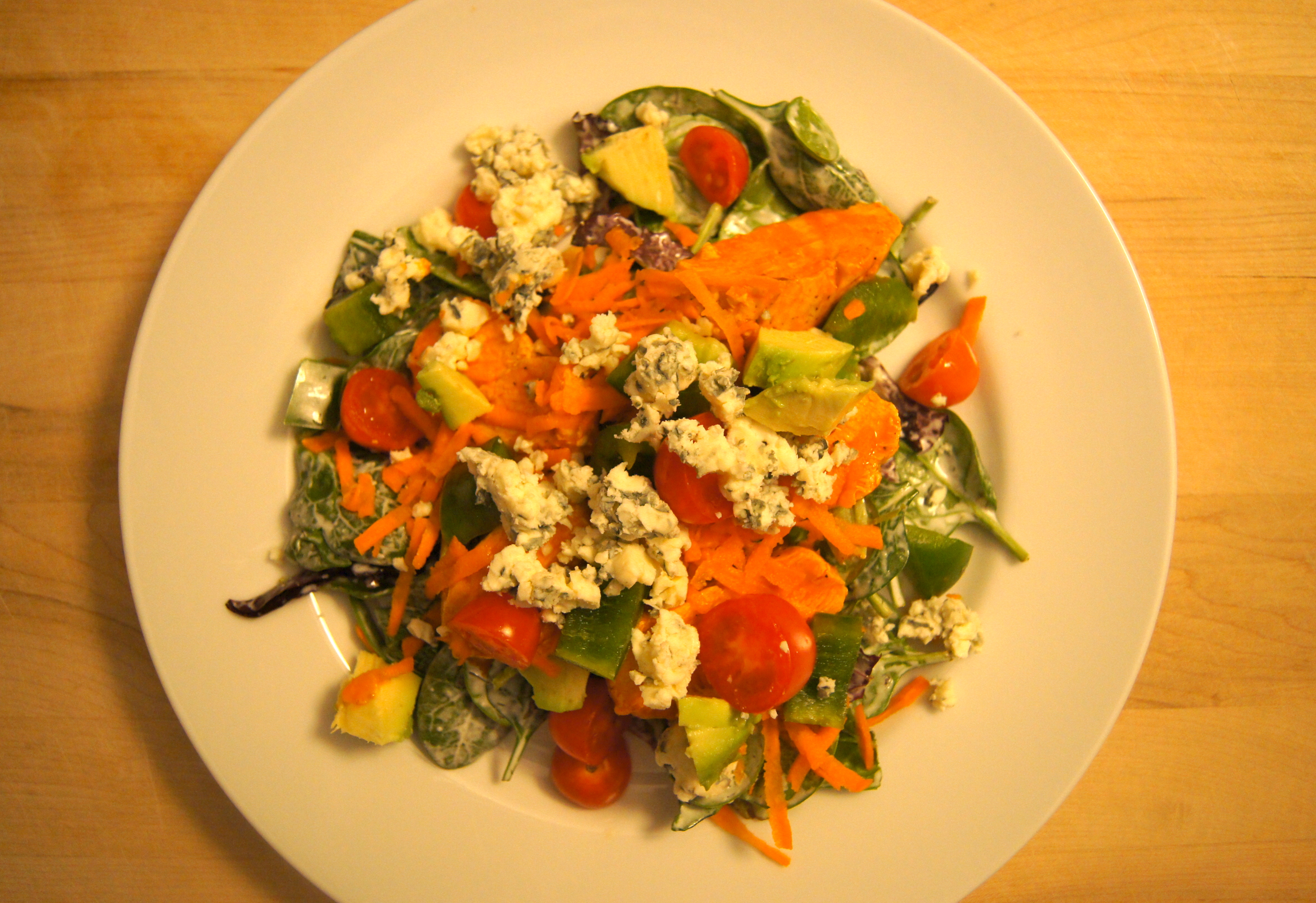 In a large bowl add the greens, tomatoes, carrots, bleu cheese, green pepper and avocado.  Pour the ranch dressing over the top and toss gently with your hands.  Distribute the salad onto plates and top with the roasted buffalo chicken.  Serves 2-3