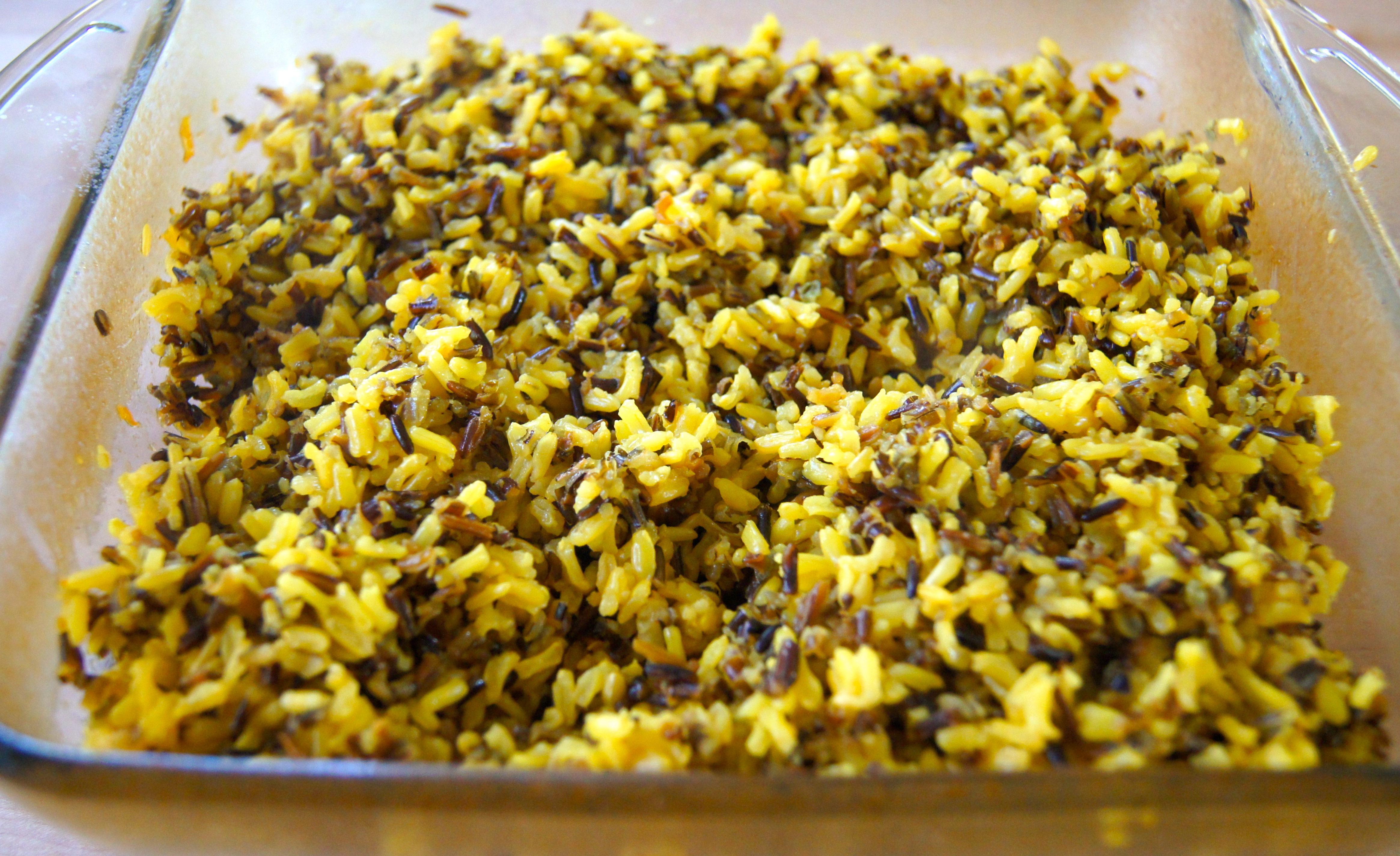 Preheat oven to 375 and grease a 8×8 glass baking dish. Pour the rice into the prepared baking dish. Place the chicken stock, butter, turmeric and salt in a small saucepan and bring to a boil. Once it’s reached a boil, pour the liquid over the rice, stir and cover it tightly with heavy duty foil. Bake in preheated oven for 1 hour. Remove and fluff with a fork. Serves 4.