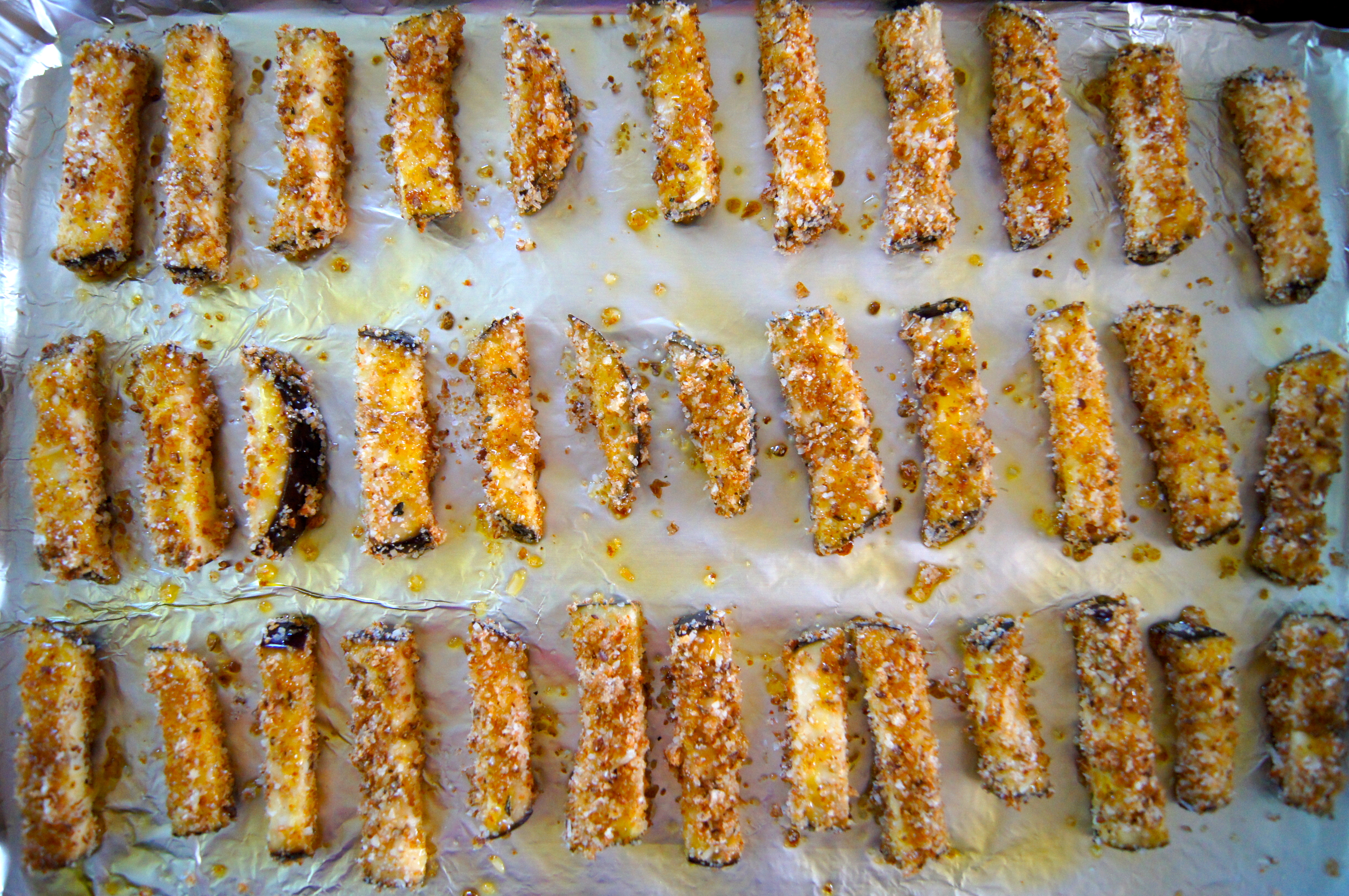 Preheat oven to 425. Lay the eggplant slices on a kitchen towel or in a colander and sprinkle the tops generously with salt (this will release most of the liquid from the eggplant so they crisp up and aren’t soggy). Let them sit for 20 minutes and then blot them with a towel to dry them. Slice them into strips about 1/4 inch thick.