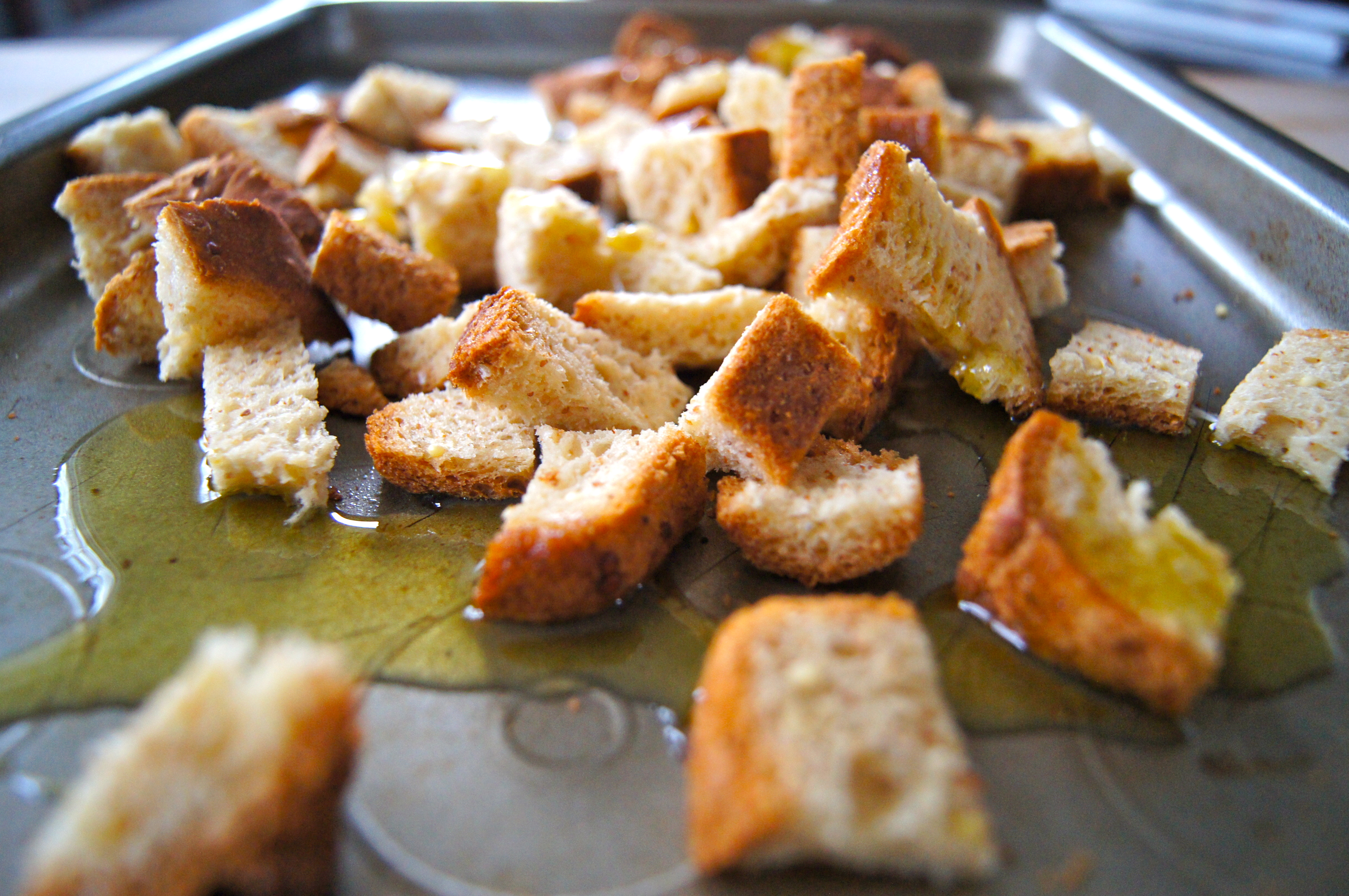 Preheat oven to 400.  Place bread cubes on a baking sheet.  Drizzle bread with olive oil and toss to coat well.  Bake for 10 minutes or until bread is golden and beginning to crisp, stirring twice in between cooking.