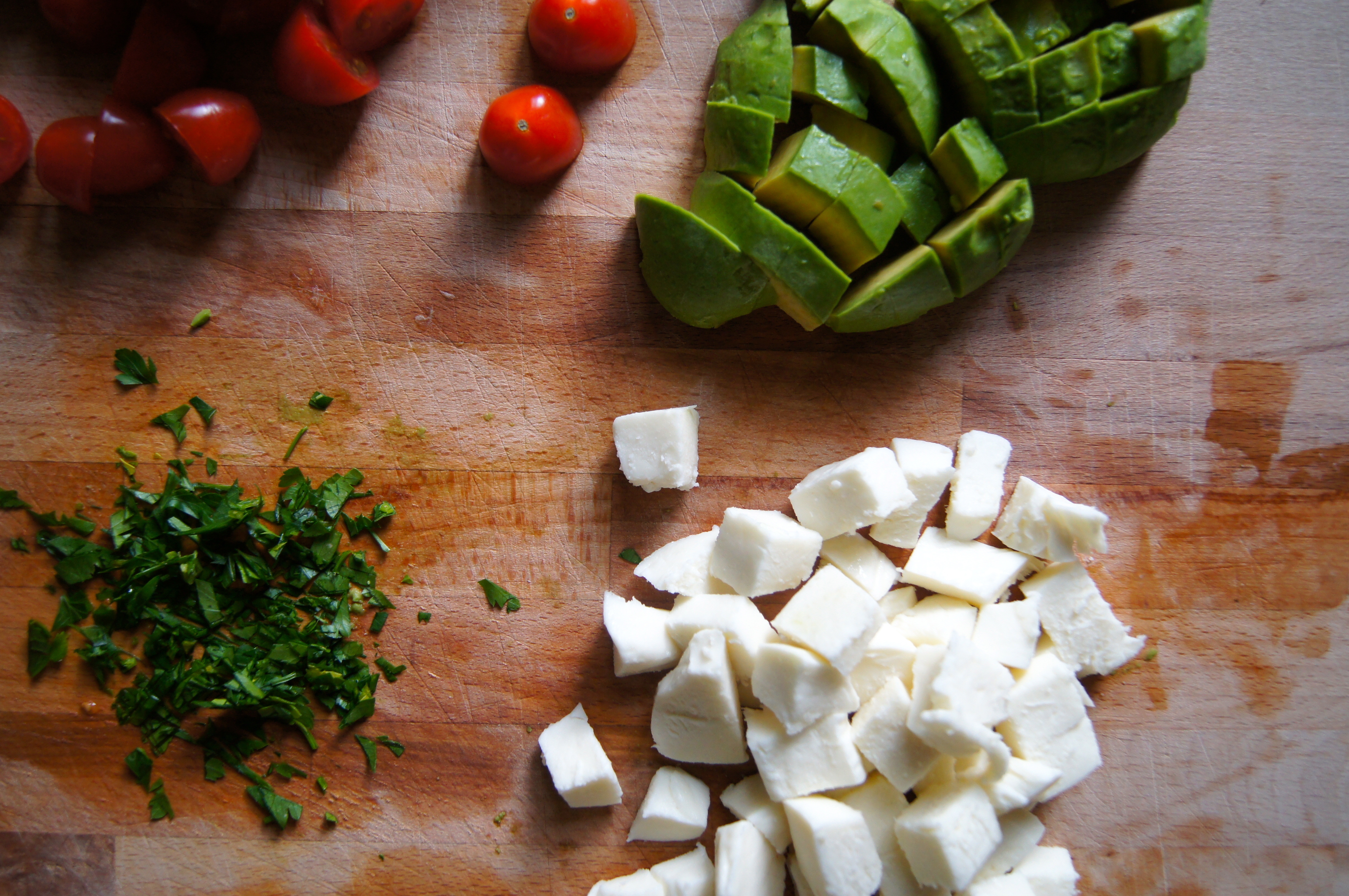Add the tomatoes, mozzarella, avocado and chopped parsley to the eggplant, toss to combine and serve.