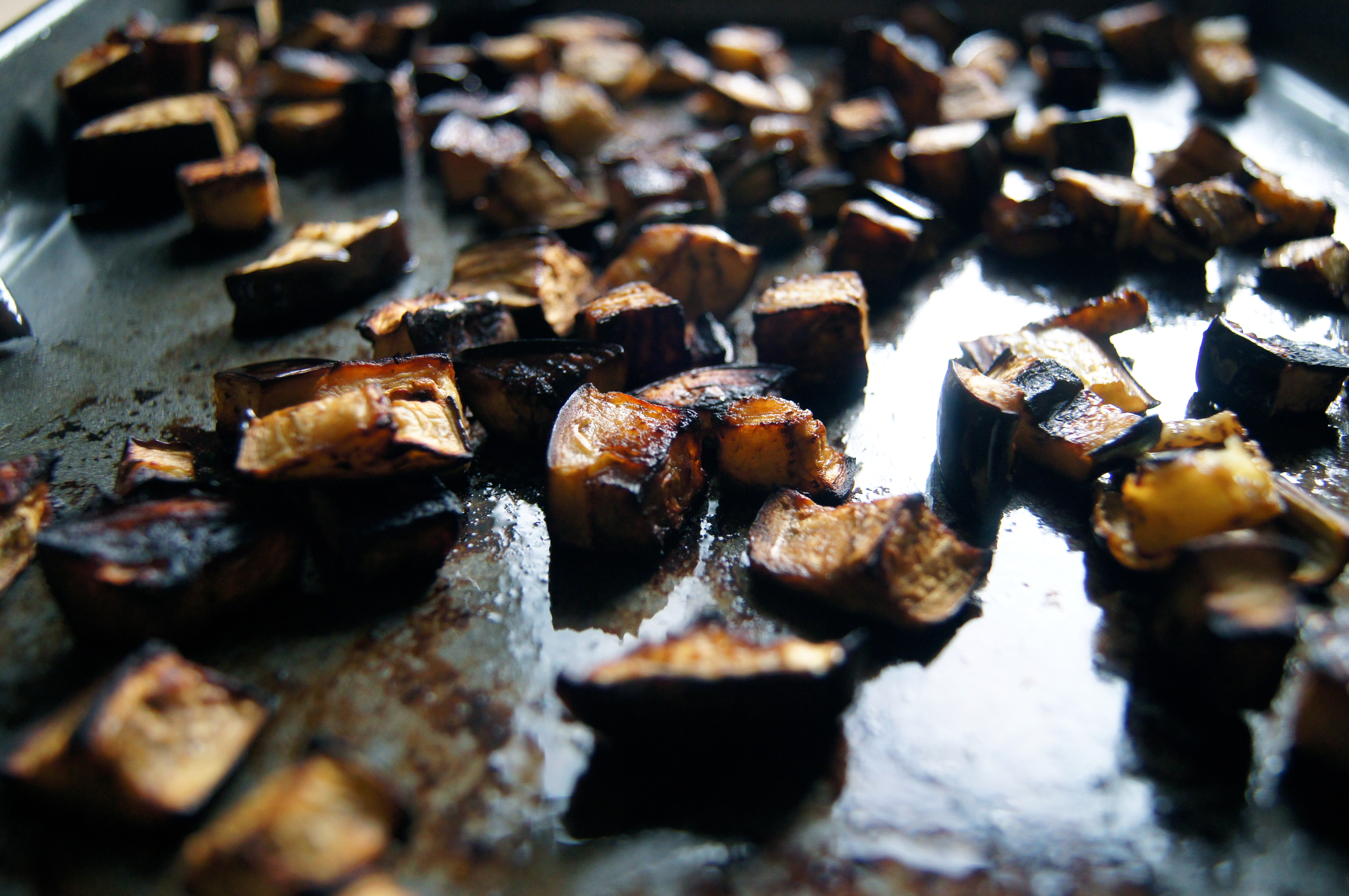 Preheat oven to 450. Place the eggplant on a baking sheet, drizzle with olive oil and balsamic vinegar and sprinkle with salt and pepper; toss to coat. Roast in the oven until golden brown, about 25 minutes, stirring twice in between. Remove from oven and place in a medium sized bowl; allow to cool for about 5 minutes.