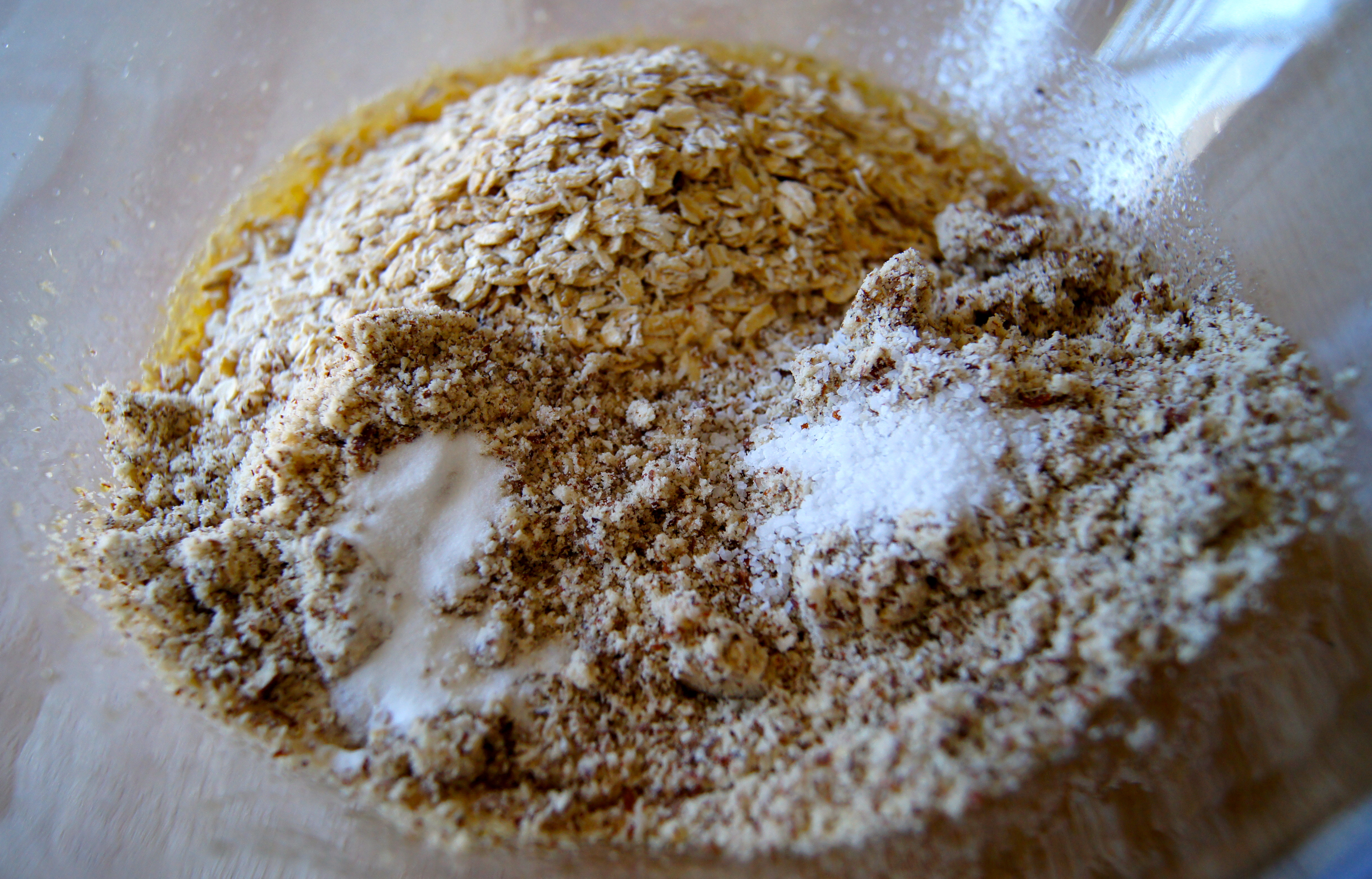 In a large bowl whisk together the eggs, coconut oil or butter, maple syrup and honey.  Place the oats in a food processor and pulse approximately 20 times or until oats are slightly ground, there will be some flour-like texture and some larger oat pieces both.  Add the oats, almond meal, baking soda and salt to the egg mixture and stir until all ingredients are combined.