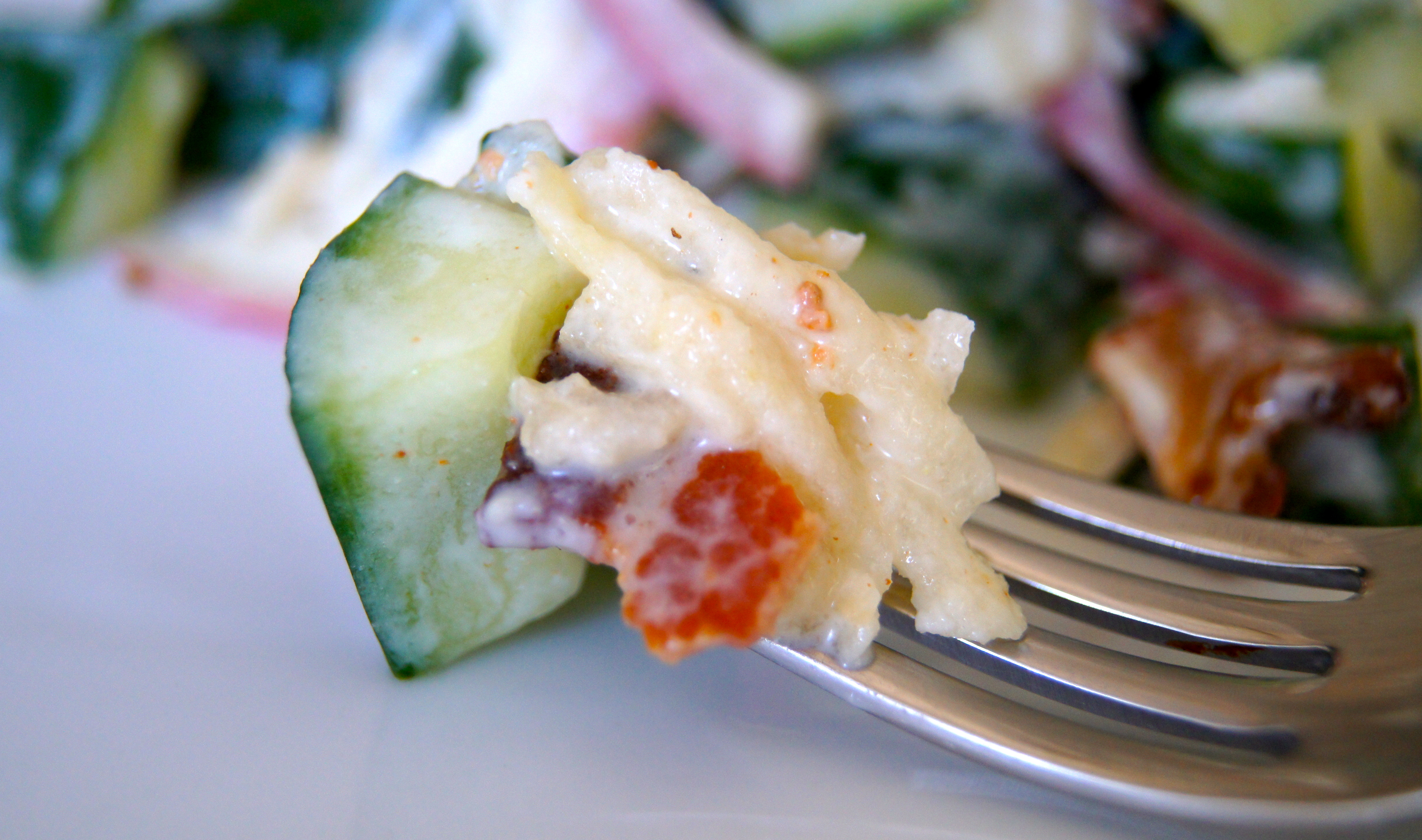 This is a fun switch to a classic summer side dish. Theres so much you can do with this recipe…adding bleu cheese or celery to the mix is wonderful, dried cranberries or cherries instead of apple is pretty delish, too. But this right here is my favorite variation; crunchy, fresh cucumber, sweet, crisp apple, and smokey bacon make an awesome team paired with the creamy, tangy dressing.