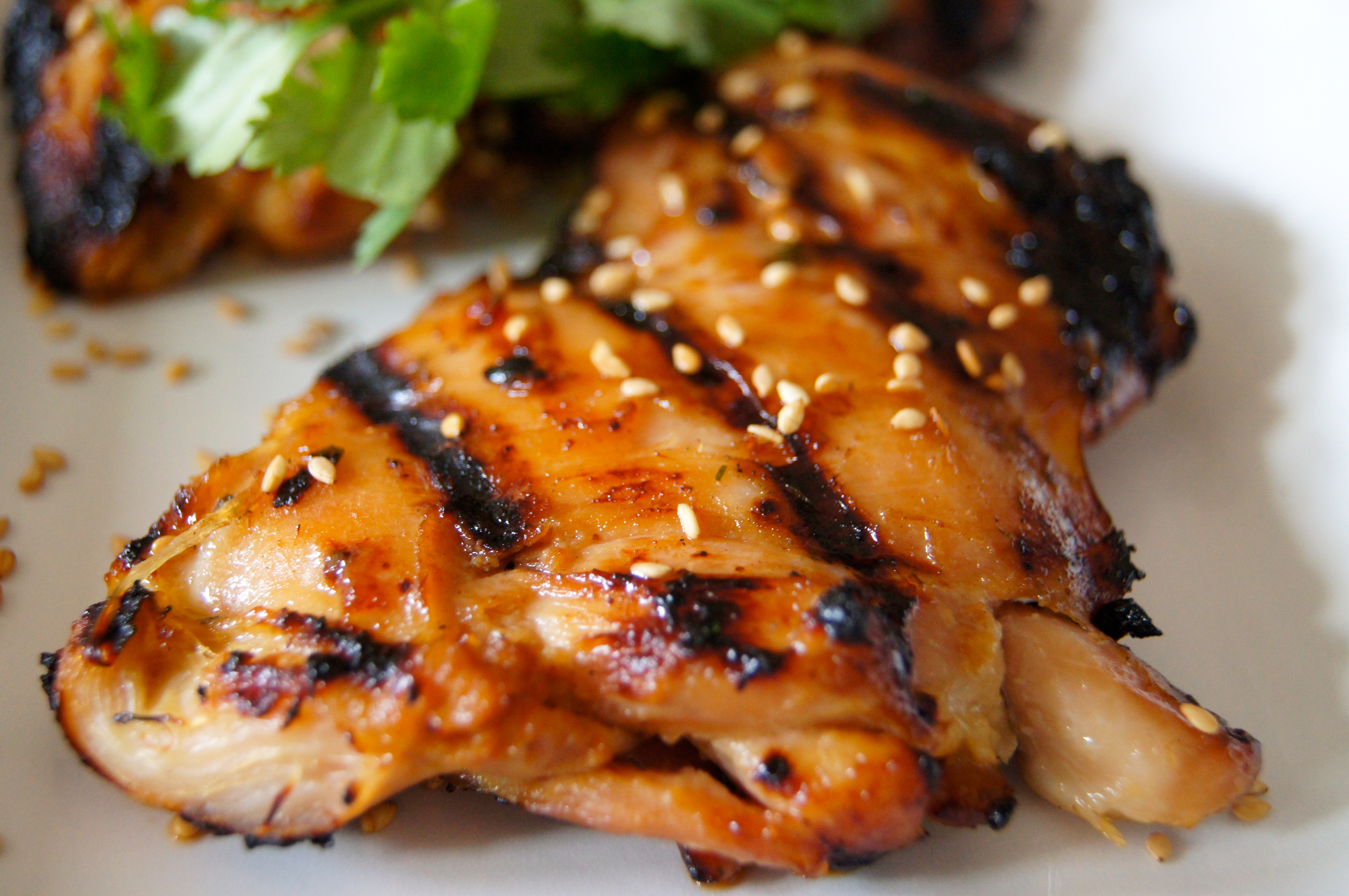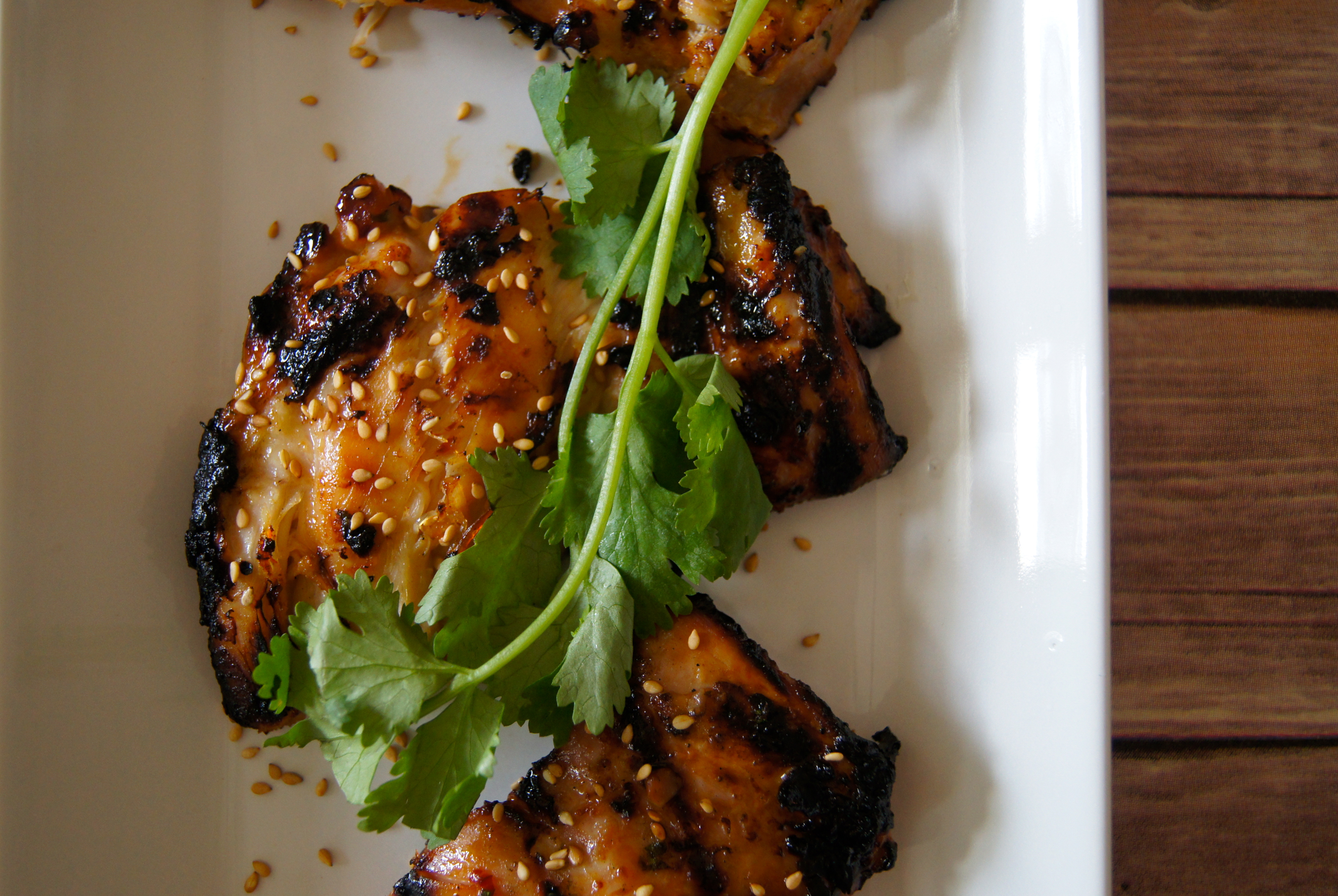 Preheat grill to medium high heat. Place chicken on the grill and cook for 10 minutes, flipping once in between cooking, or until chicken is thoroughly cooked thru. Serve topped with toasted sesame seeds and cilantro leaves. Serves 4-6.