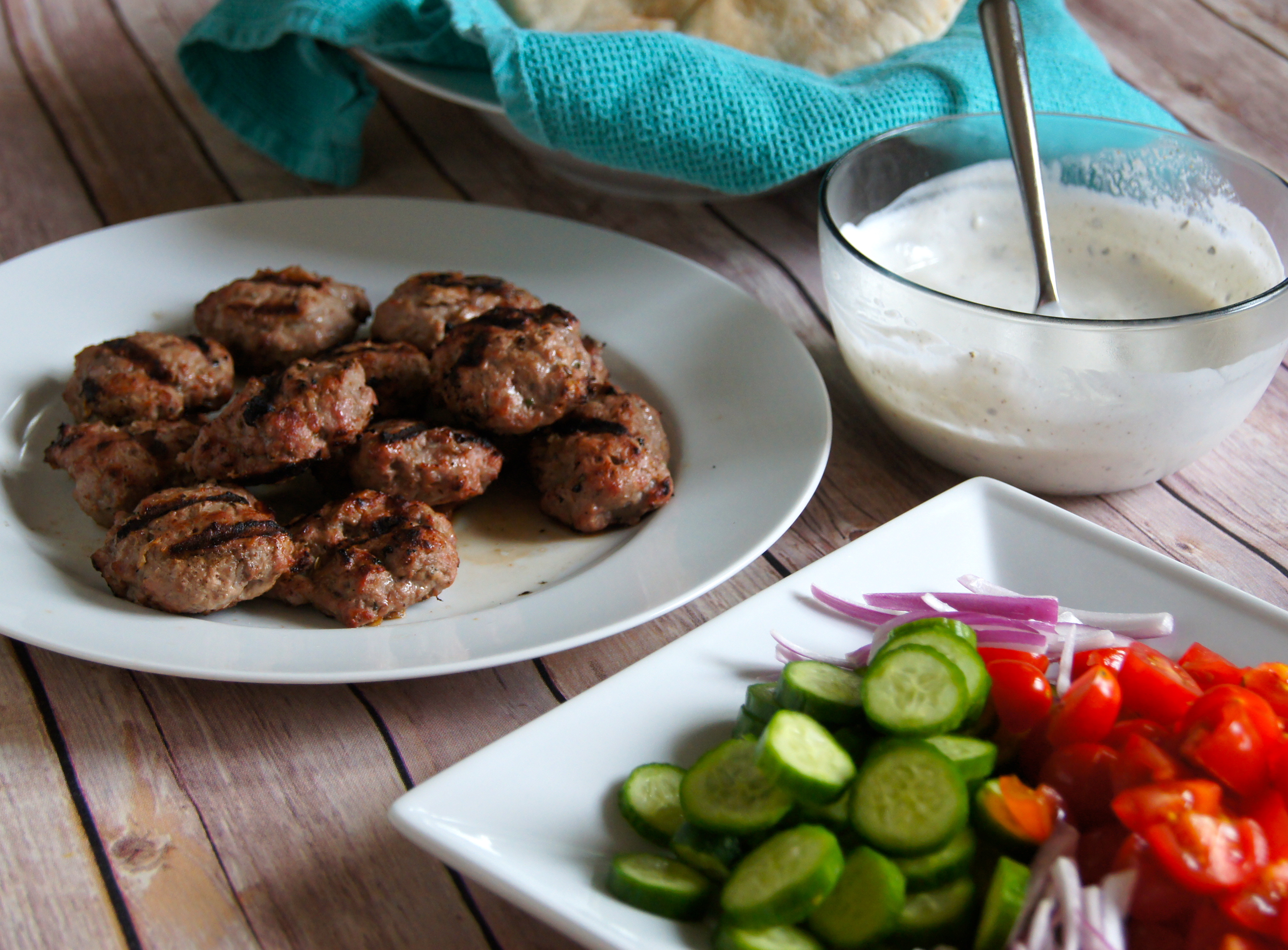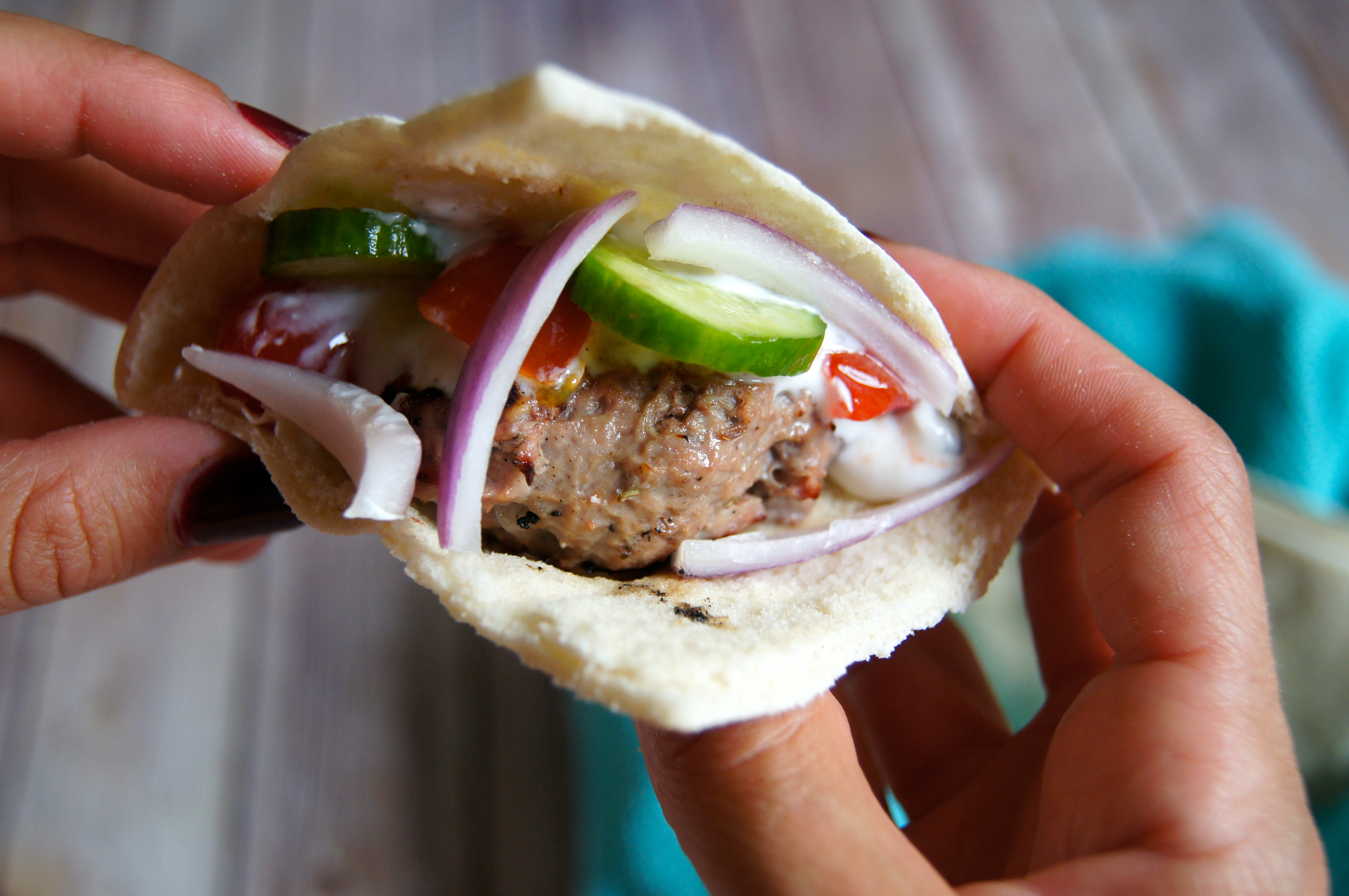 Preheat grill to medium high heat. Cook kafta on the grill for 5 minutes, flipping once in between cooking, or until desired doneness. Serve in pita bread or piled on a plate topped with tomato, cucumber, red onion and yogurt sauce.