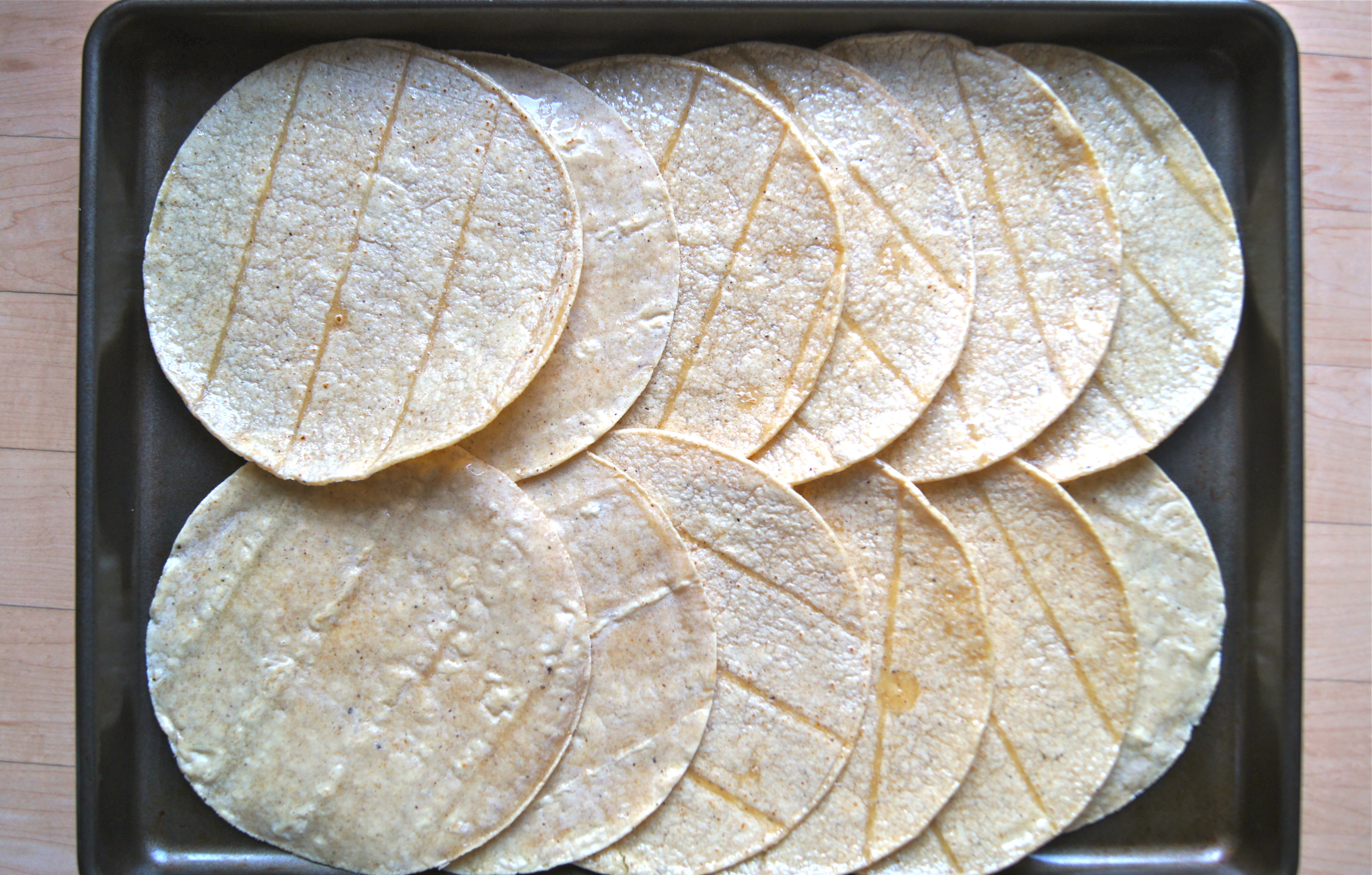 Preheat oven to 350.  Brush both sides of the tortillas with oil and lay flat on a baking sheet (it is okay if they overlap slightly).  Bake for 4 minutes or until very soft-make sure you do not allow them to crisp up.