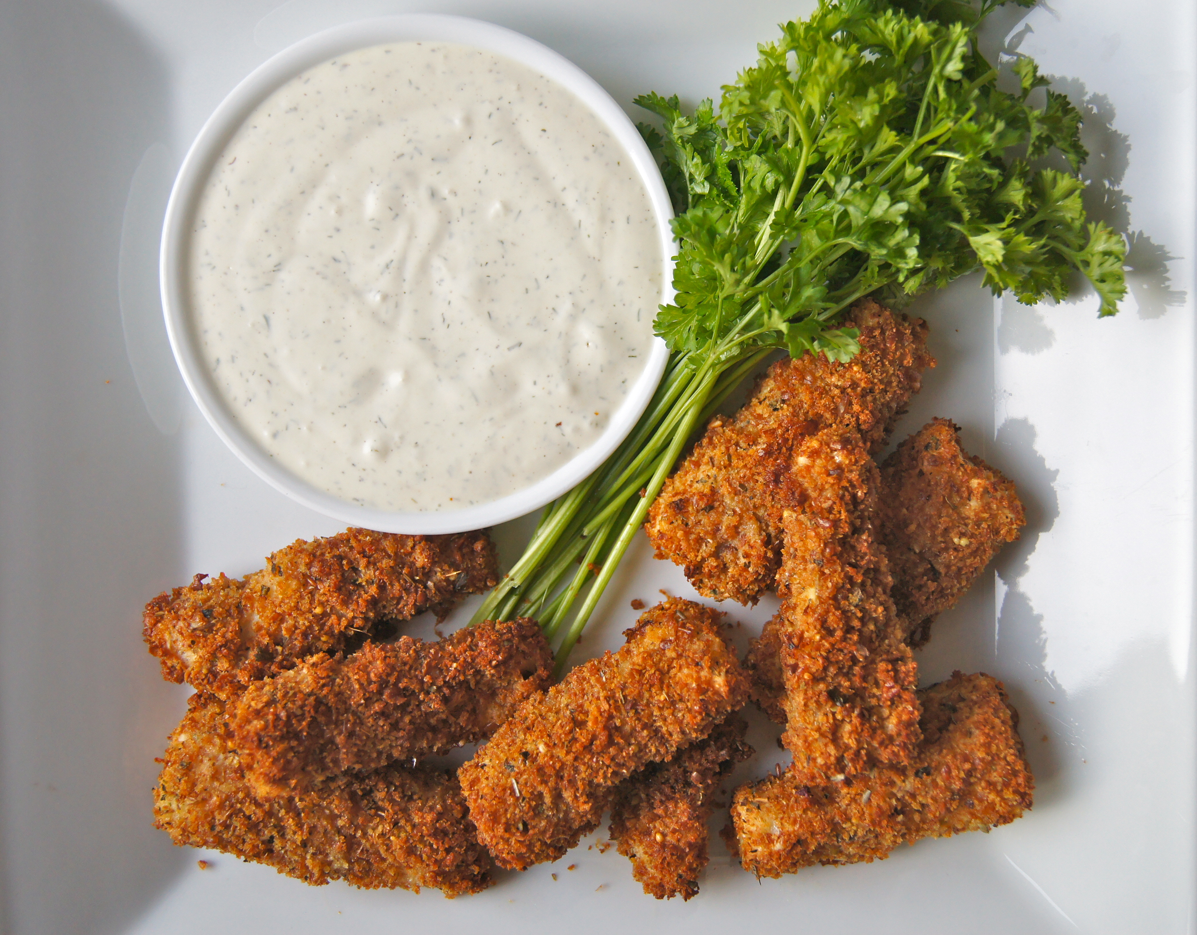 Crispy Oven Fish Sticks with Dill Yogurt Sauce