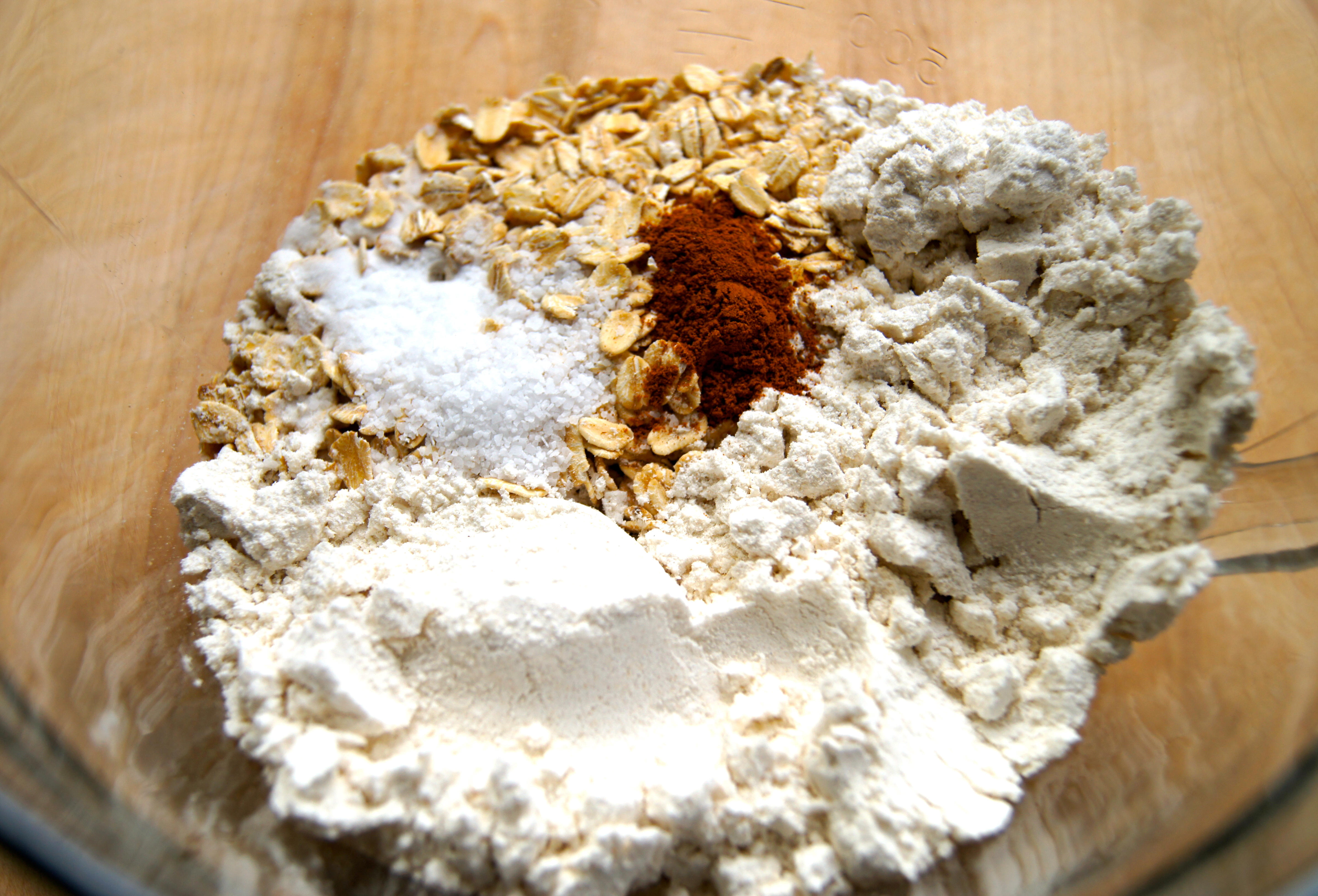 Preheat oven to 350 and line a baking sheet with parchment paper or a silicone mat. In a medium sized bowl whisk together the oats, flour, cinnamon, baking soda and salt; set aside.