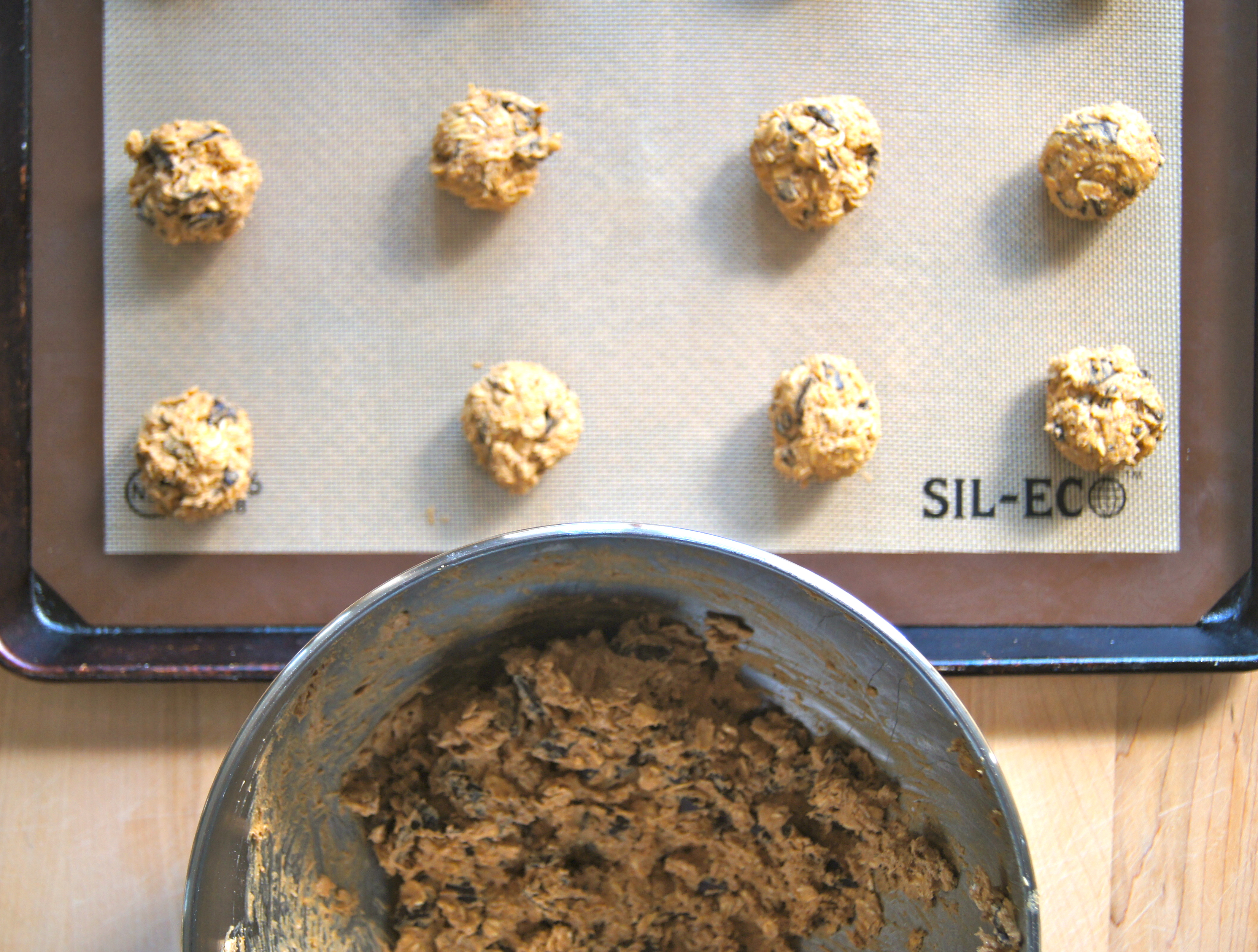 Roll the dough into golf-ball sized balls (approximately 2 Tablespoons in size) and place on the prepared baking sheet, about 2 inches apart.  Bake for 8-9 minutes or until bottoms just begin to turn golden (the centers will still look undercooked).  Cool before removing from the baking pan and store in an air tight container for up to 5 days.  Makes 18-20 cookies.