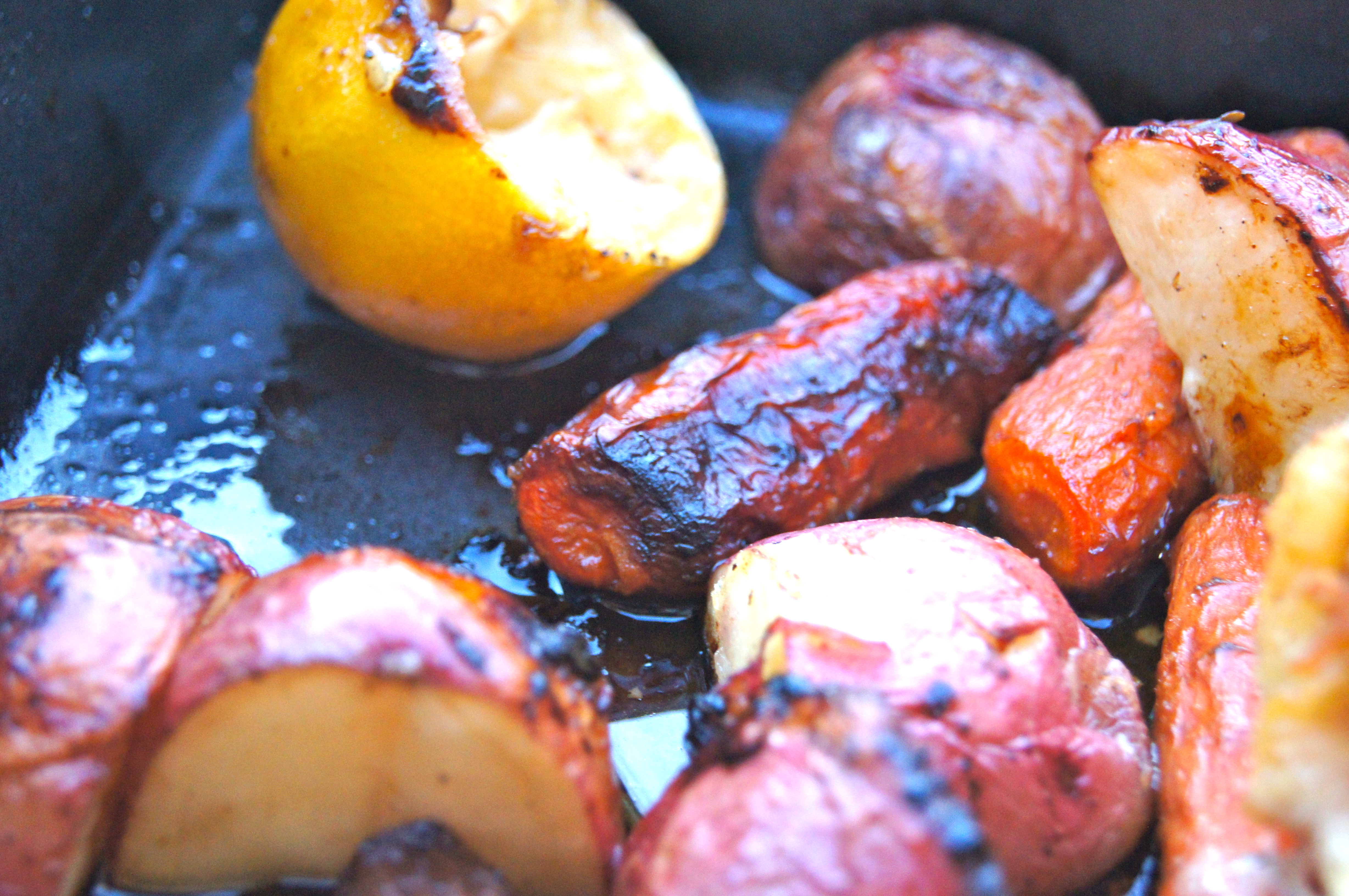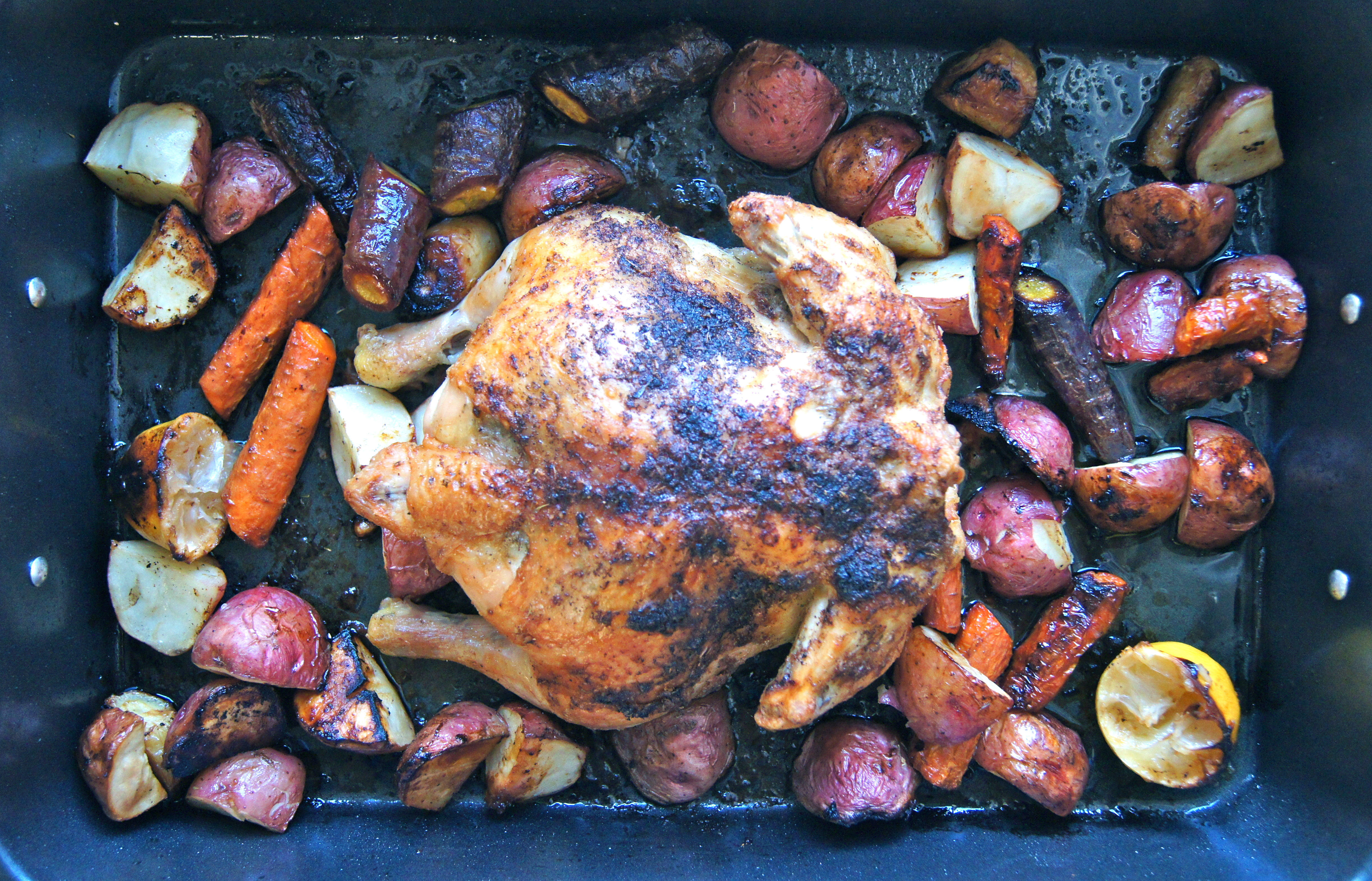 It will take you a total of 3 minutes and 12 seconds to get this in the oven, for real. Throw a few seasonings in a bowl and mash it together with some softened butter. Spread it all over that cute little chick-a-dee and toss a few potatoes and carrots around it. And don’t even bother peeling those potatoes or carrots…I know you don’t have time for that garbage…and those skins caramelize as if you doused them in brown sugar before putting them in the pan.