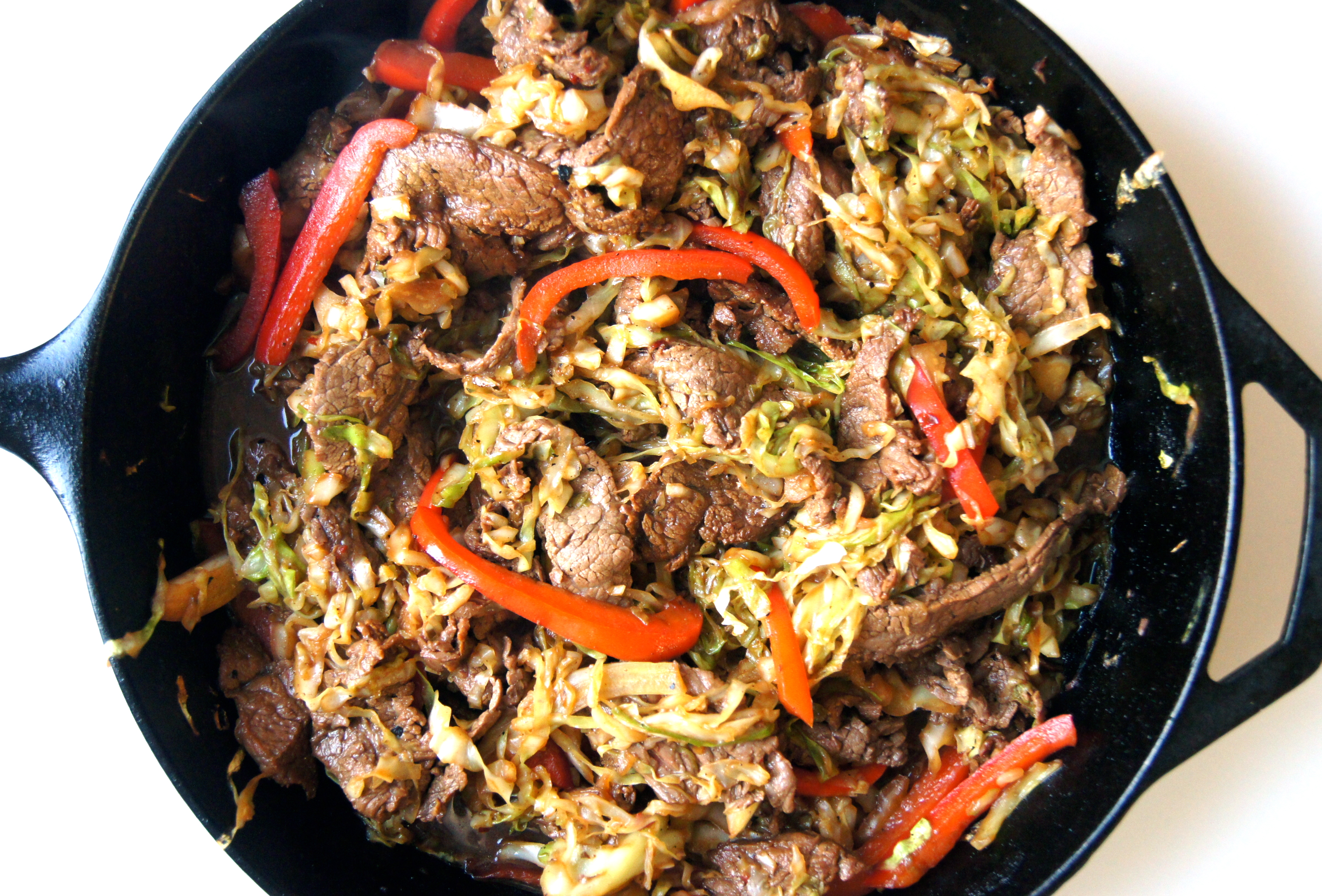 Heat the oil in a wok or large skillet (my cast-iron skillet works just fine here) over medium high heat.  Add marinated steak in a single layer and cook for 30 seconds without touching.  After 30 seconds give it a stir and cook for 1 additional minute or until steak is no longer pink on the outsides, stirring frequently.  Add cabbage and bell pepper and cook, stirring often,  for 2-3 additional minutes or until veggies are crisp-tender.  Stir in remaining 3 tablespoons marinade and cook for 2 additional minutes or until sauce thickens.  Serve topped with peanuts, cilantro and green onion.  Serves 4-6.