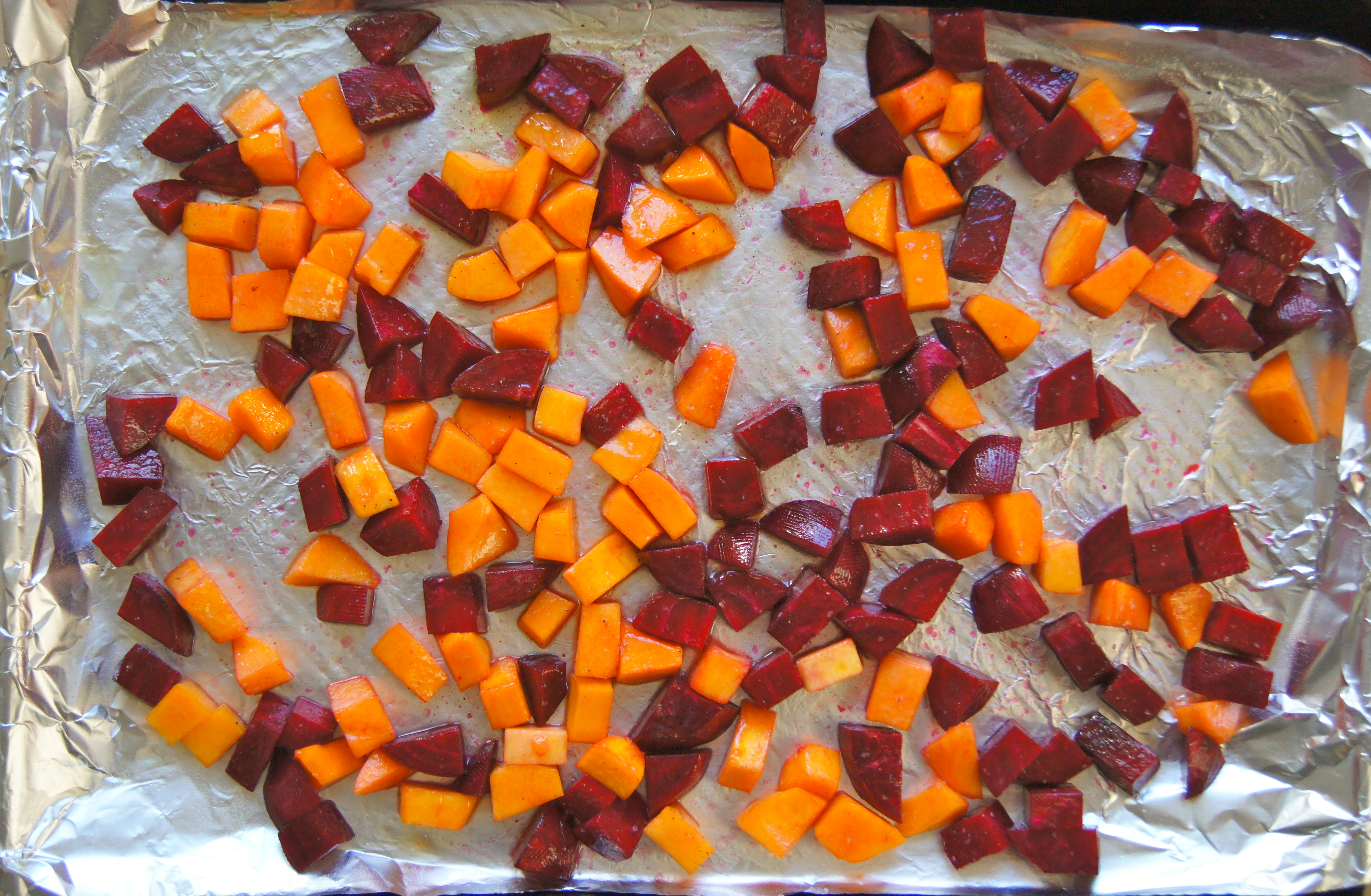 Preheat oven to 425 and line a baking sheet with foil. Place beets and butternut squash on baking sheet, drizzle with 2 tablespoons olive oil, maple syrup and sprinkle with salt and pepper. Toss well to coat and roast in the oven for 30-40 minutes or until soft with slightly browned edges.