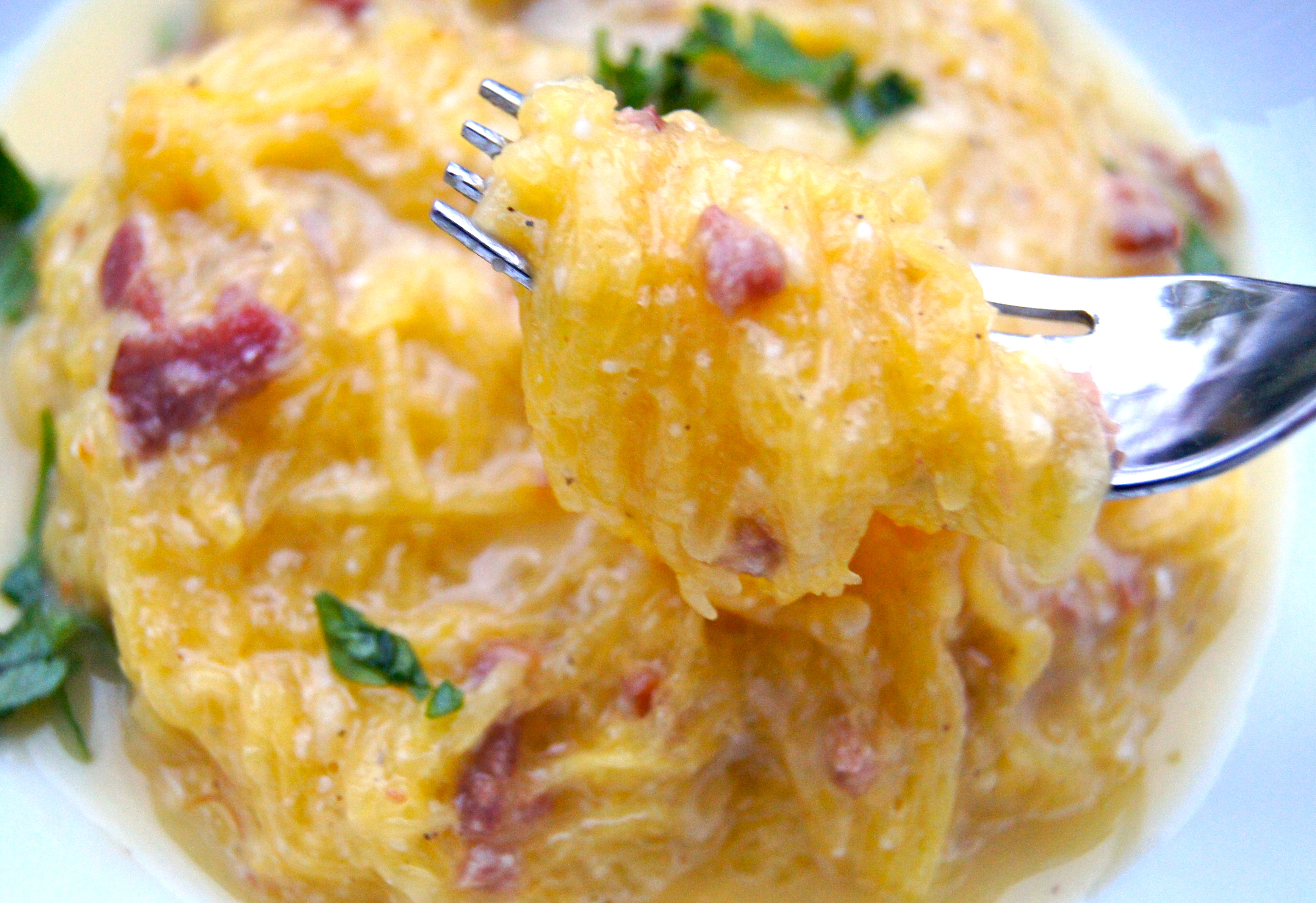 Once bacon is browned add the spaghetti squash to the pan and toss with the bacon/drippings to coat.  Remove pan from the heat and add egg mixture, stir well to  coat the squash (stirring quickly and removing the pan from the heat source will ensure the eggs will not scramble and will form a beautiful sauce).  Season with salt and pepper to taste, garnish with parsley and serve.  Serves 2-4 as a main course.