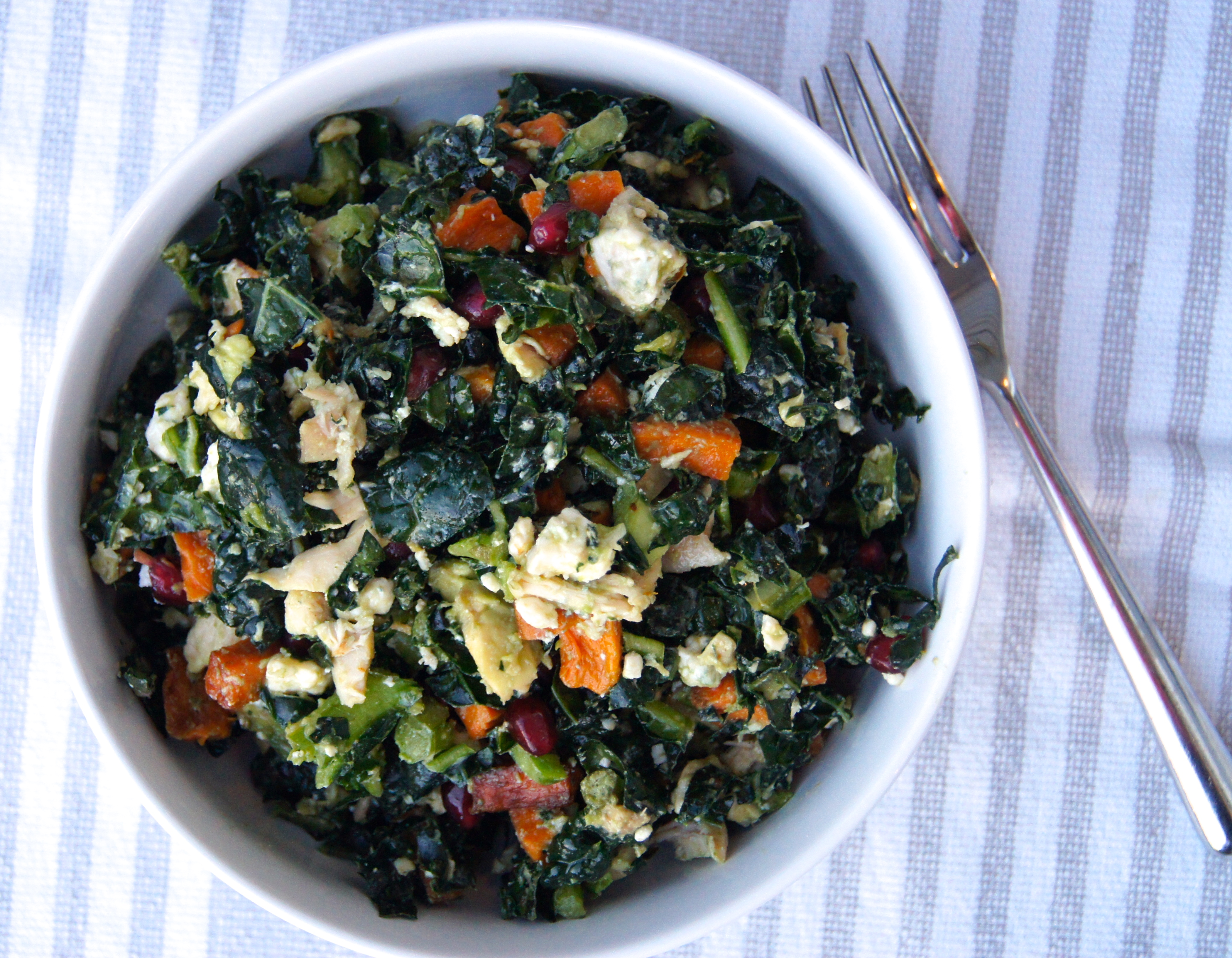 Place the kale, chicken, bleu cheese and pomegranate seeds in a large bowl. Drizzle with enough vinaigrette to coat and toss well. Add the avocado and roasted sweet potatoes and gently toss. Serve with additional vinaigrette on the side. Serves 2+ as a main course.