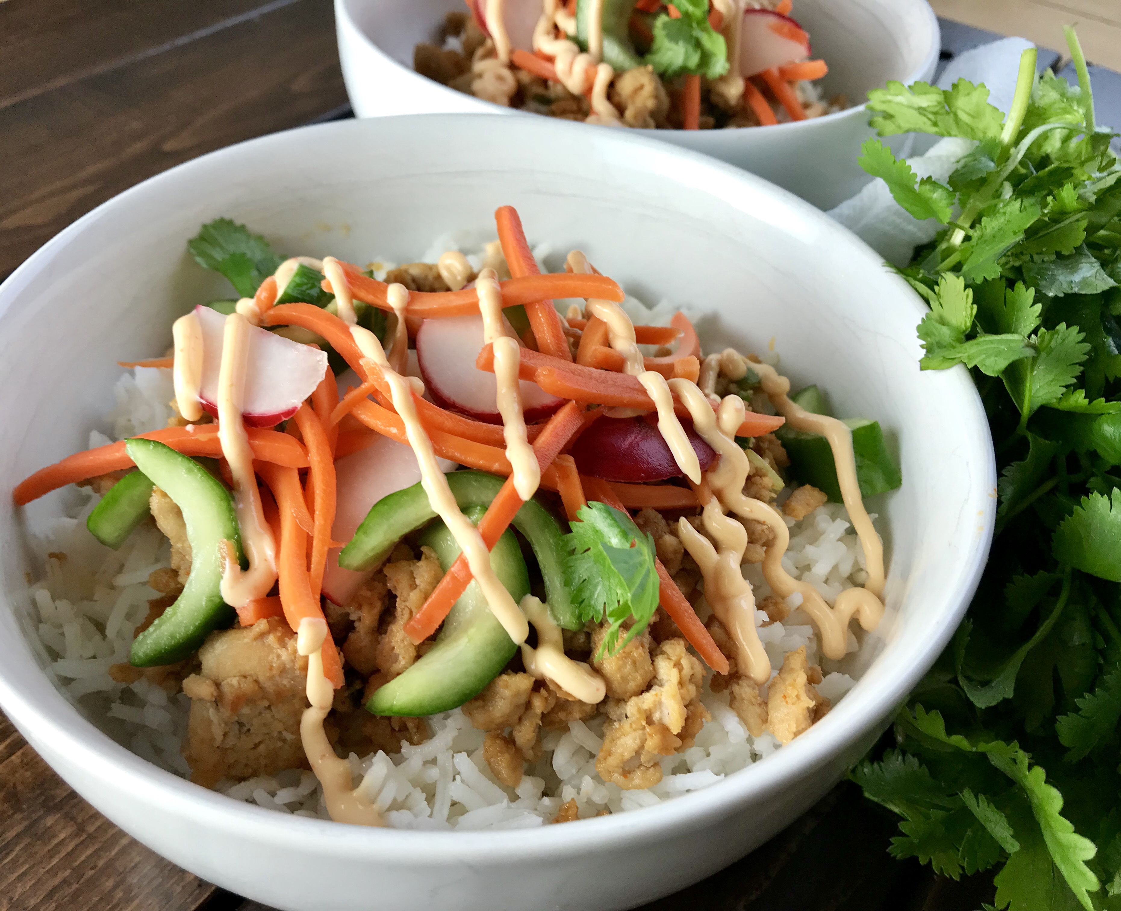 Pile rice or quinoa in a bowl. Top with a heaping mound of Chicken Filling, Pickled Veggies and Sriracha mayo and sprinkle with cilantro. Serves 4+