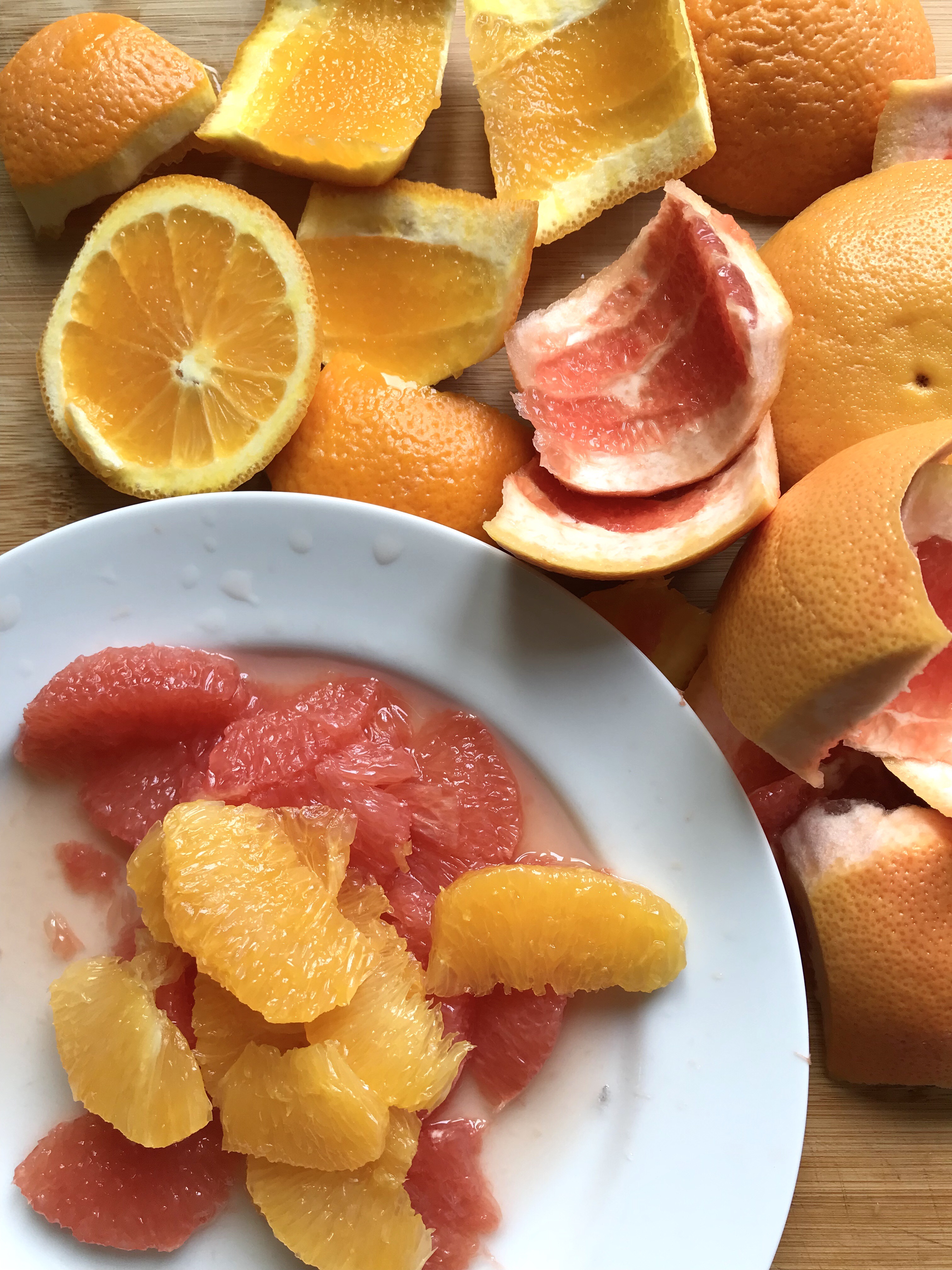 Note: segmenting your citrus fruit is very simple…just follow this video. Once you’ve got the fruit segmented, squeeze the juices from the remaining membranes for the vinaigrette.