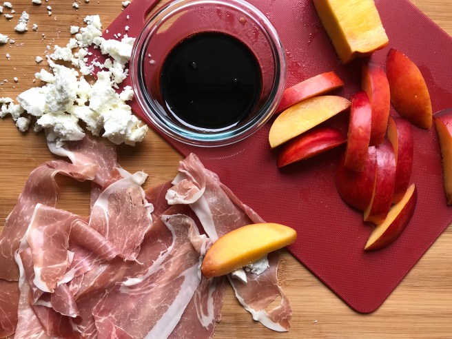 Lay out a piece of proscuitto and place about a teaspoon of goat cheese on one end. Lay a nectarine slice on top of the goat cheese and roll up; repeat with remaining proscuitto/goat cheese/nectarine. Can be made ahead and stored in the refrigerator for up to five hours.