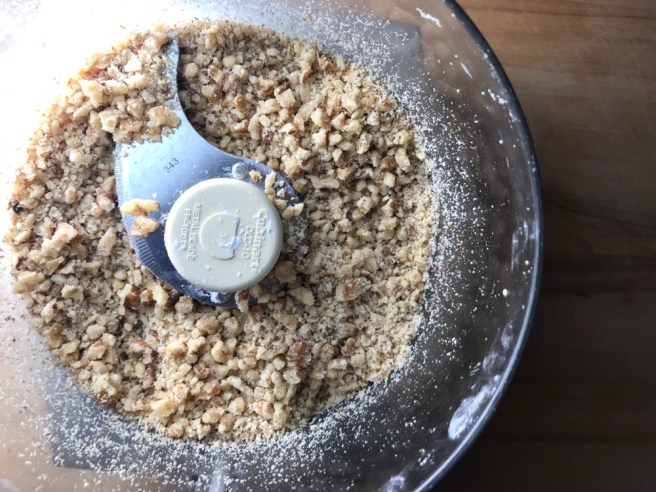 Add the walnuts and corn starch to the bowl of a food processor and pulse about 10-15 times or until walnuts are chopped fine. Place the mixture on a large plate.