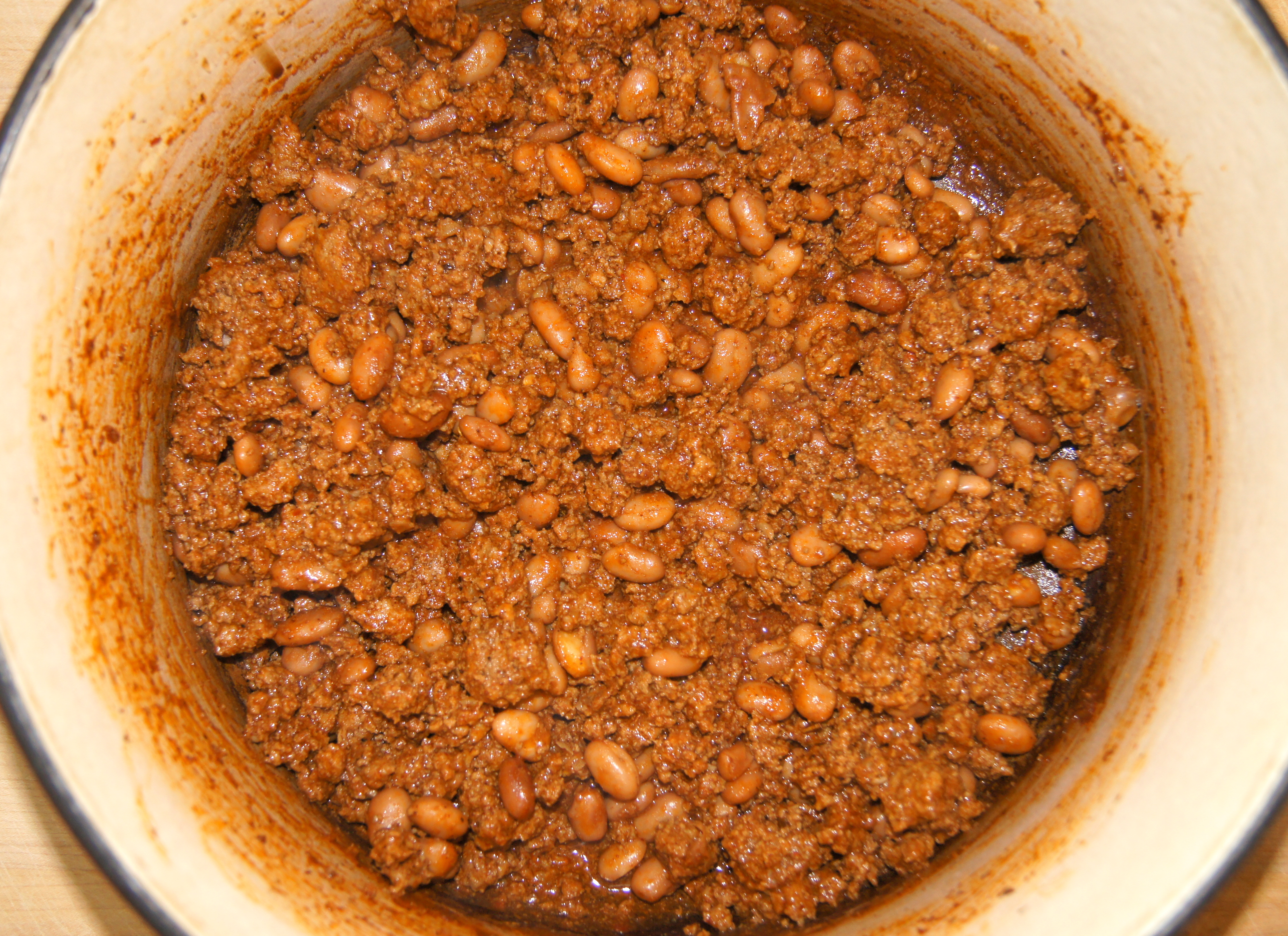 Brown ground beef or turkey in a large skillet and drain fat. Add taco seasoning, tomato paste, beans and water and simmer over medium heat for five minutes, stirring occasionally.