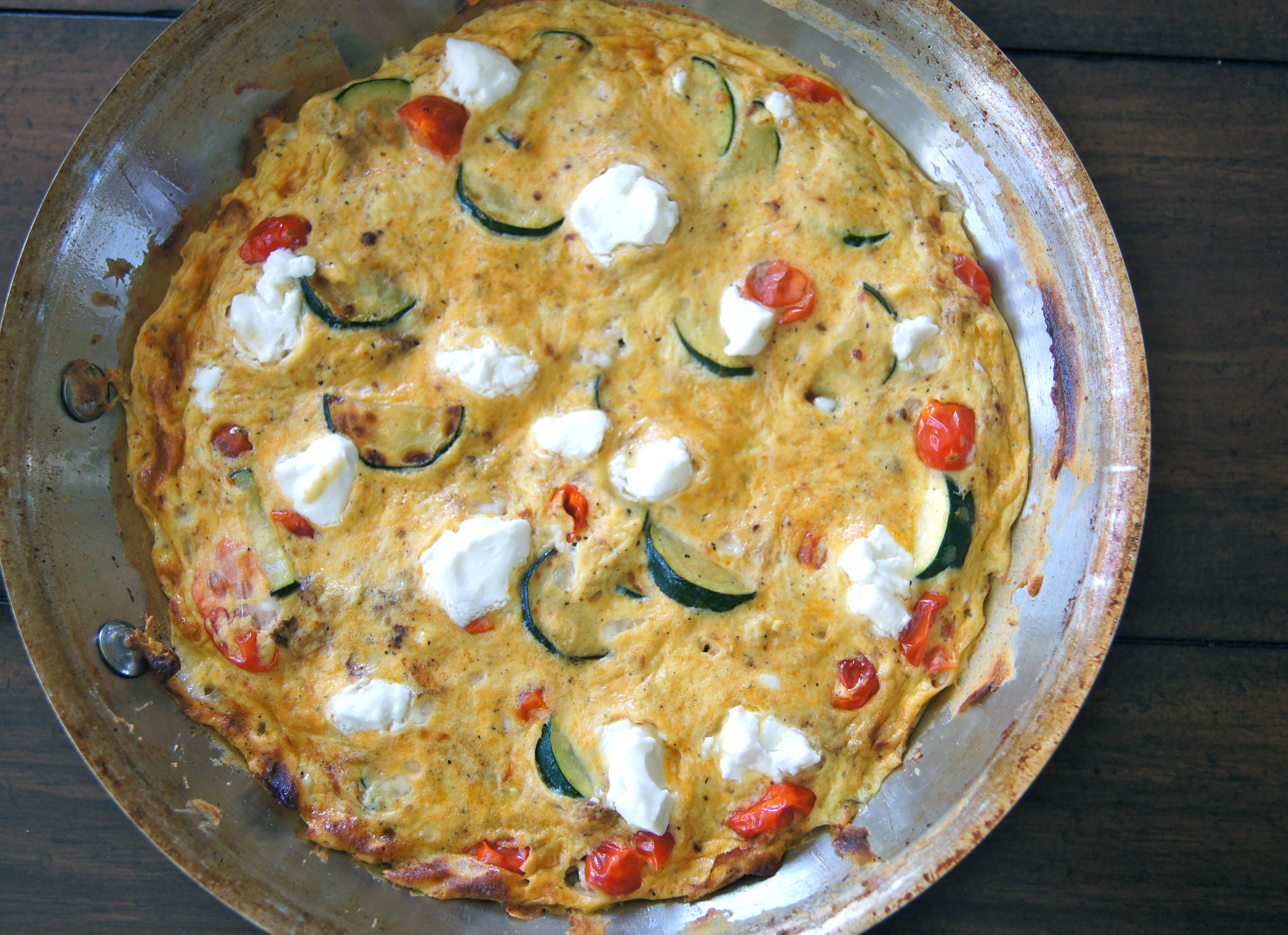 Preheat broiler and place rack in the middle of the oven. In a medium bowl whisk together eggs, cottage cheese, salt, pepper and milk. Heat a 10-inch ovenproof skillet over medium high heat and add olive oil. Add zucchini and tomatoes and cook for 4 minutes or until tomatoes begin to burst and zucchini begins to brown, stirring occasionally. Turn down the heat to medium, stir in the egg mixture and scramble the mixture just as you were scrambling eggs for 2 minutes. After 2 minutes spread the egg/veggie mixture evenly with the back of a spoon to cover the surface of the pan (mixture will still be runny), place pieces of goat cheese on top and let sit over medium heat for 15 seconds. Remove from stove and place under the broiler, 1-3 minutes or until top is no longer runny. This is what it should look like when you take it out of the oven