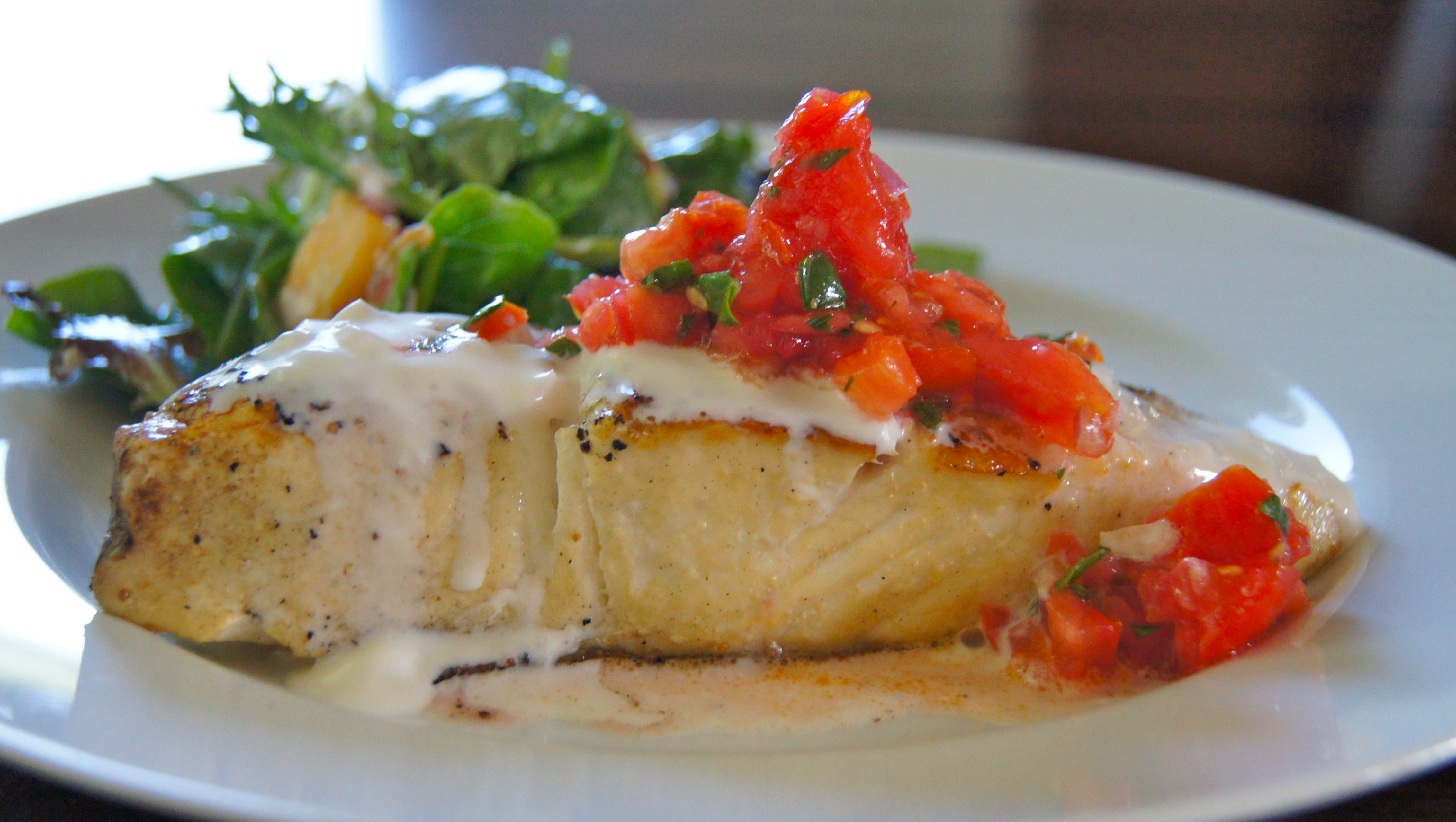 This dish is as fresh tasting as you can get; the flavor will knock your socks off. My sister found this recipe many moons ago and the minute she shared it with me I fell in love. Not only is it amazing tasting..its health profile is pretty darn attractive. The fish provides huge amounts of protein, omega-3 essential fats, magnesium and potassium. Pair that with the healthy whole fat of the cream sauce and the antioxidants and lycopene (which is thought to have a cancer protective effect) from the tomatoes and you’ve got a serious winner. The cream sauce and tomato relish are also tasty on shrimp, tilapia or mahi mahi but we tend to splurge and go for the halibut the majority of the time-a treat you will not regret.