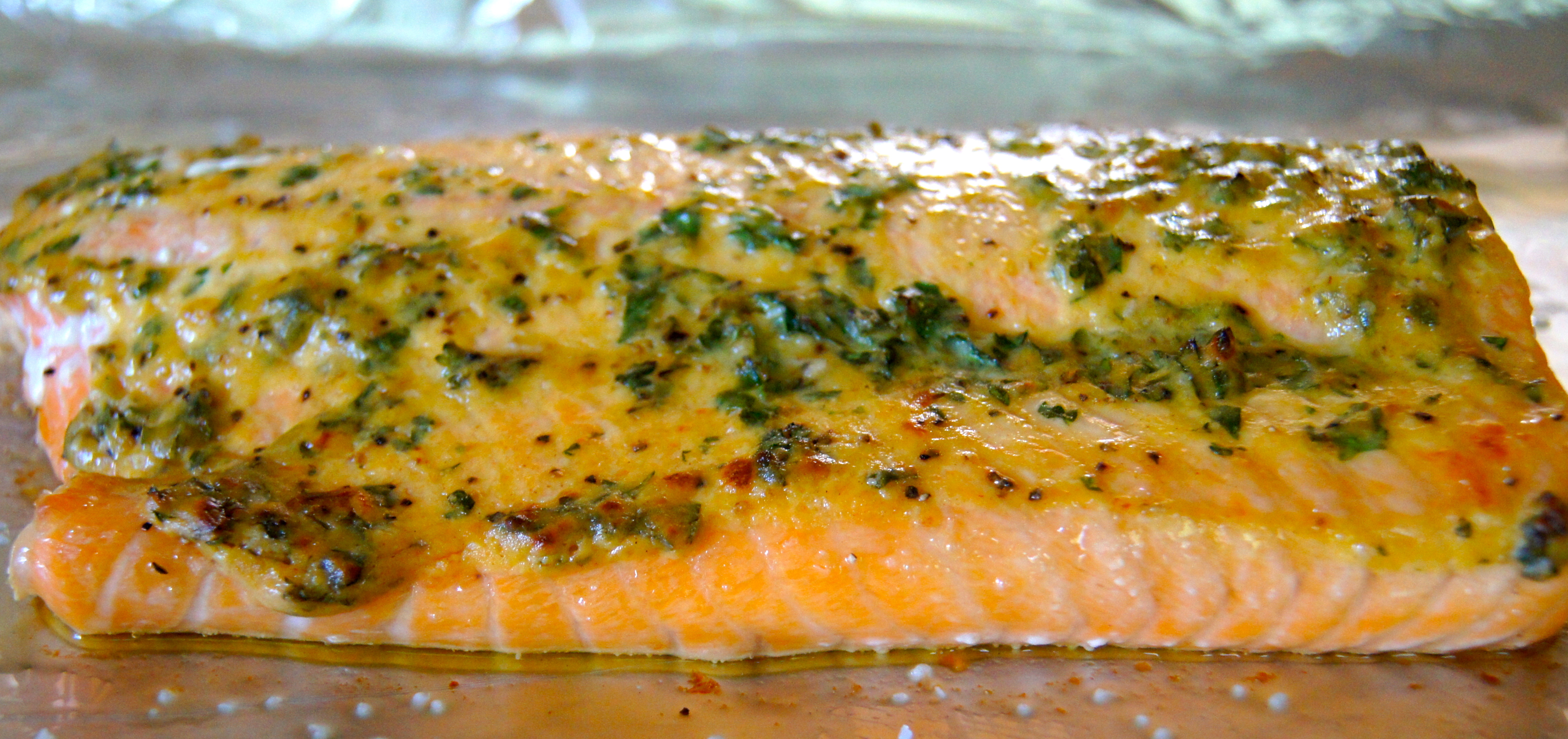 Heat the oven to 275 and line a baking sheet with foil. Brush the foil with 1/2 tablespoon olive oil. In a separate boil whisk together the remaining 1 tablespoon olive oil, dijon mustard and parsley. Lay salmon filet(s) skin side down on the prepared baking sheet, spread the olive oil/dijon mixture over the top and season liberally with salt and ground black pepper. Place in the preheated oven and bake for 18 minutes or until the fish is just opaque in the center. Turn the oven to broil and cook for an additional 2 minutes or until top just begins to turn golden. Serves 3-4