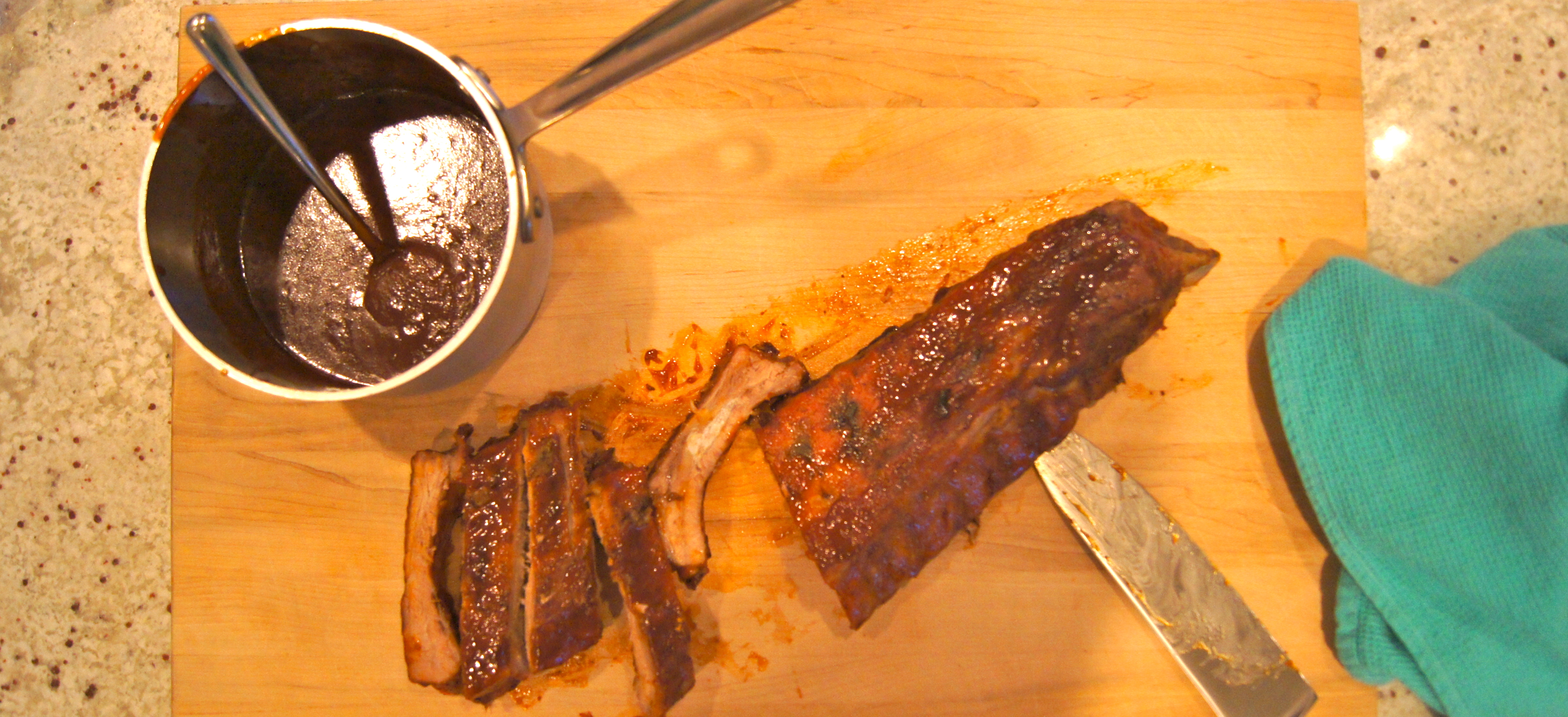 Preheat the broiler and flip the ribs over on the baking sheet so that the meat side is down. Brush with the sauce and put under the broiler for five minutes. Turn the ribs over, brush with more sauce and place under the broiler again for 7-8 minutes or until they start to char. Remove from the oven and serve with the remaining sauce. Serves 4-6