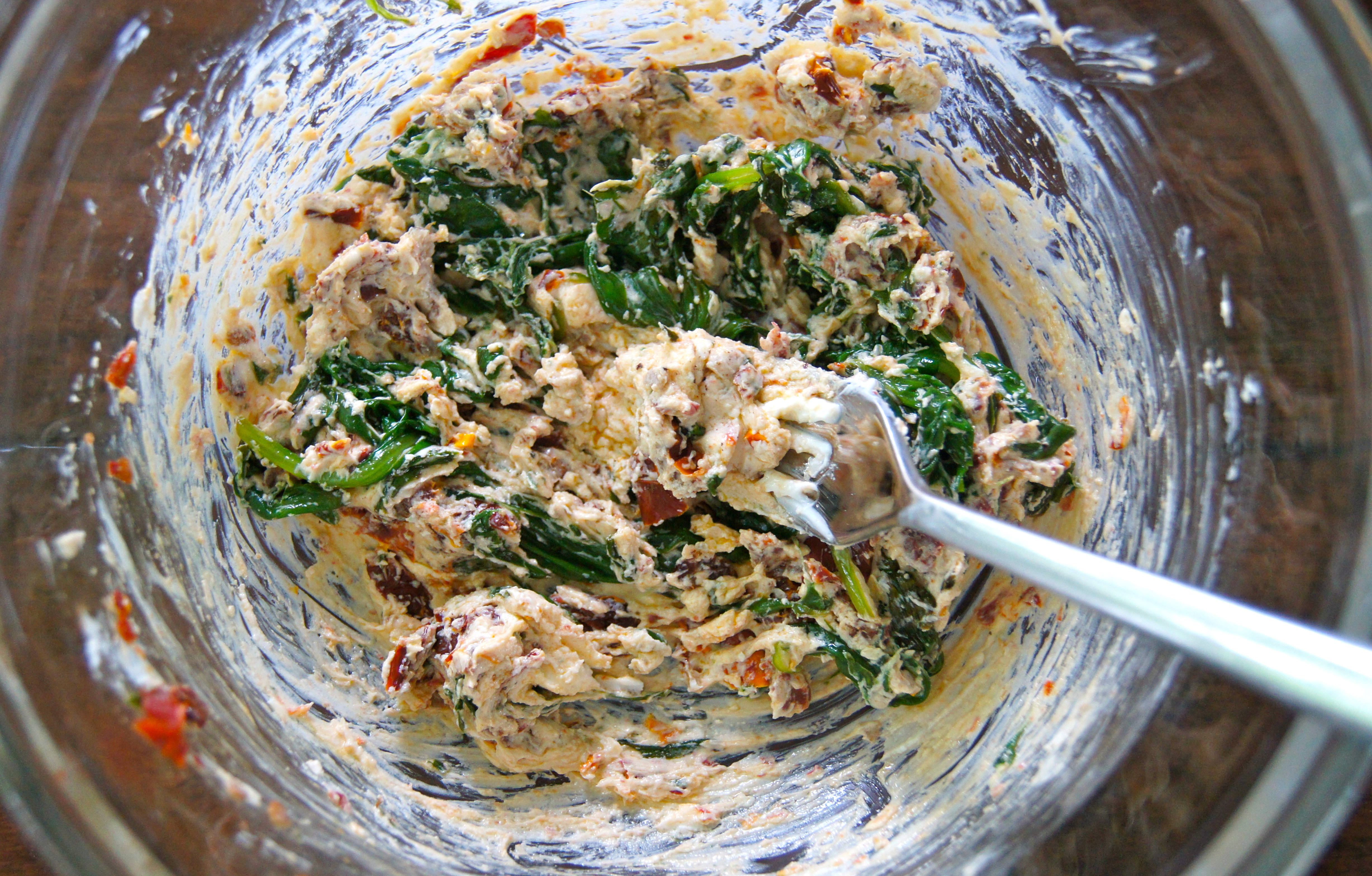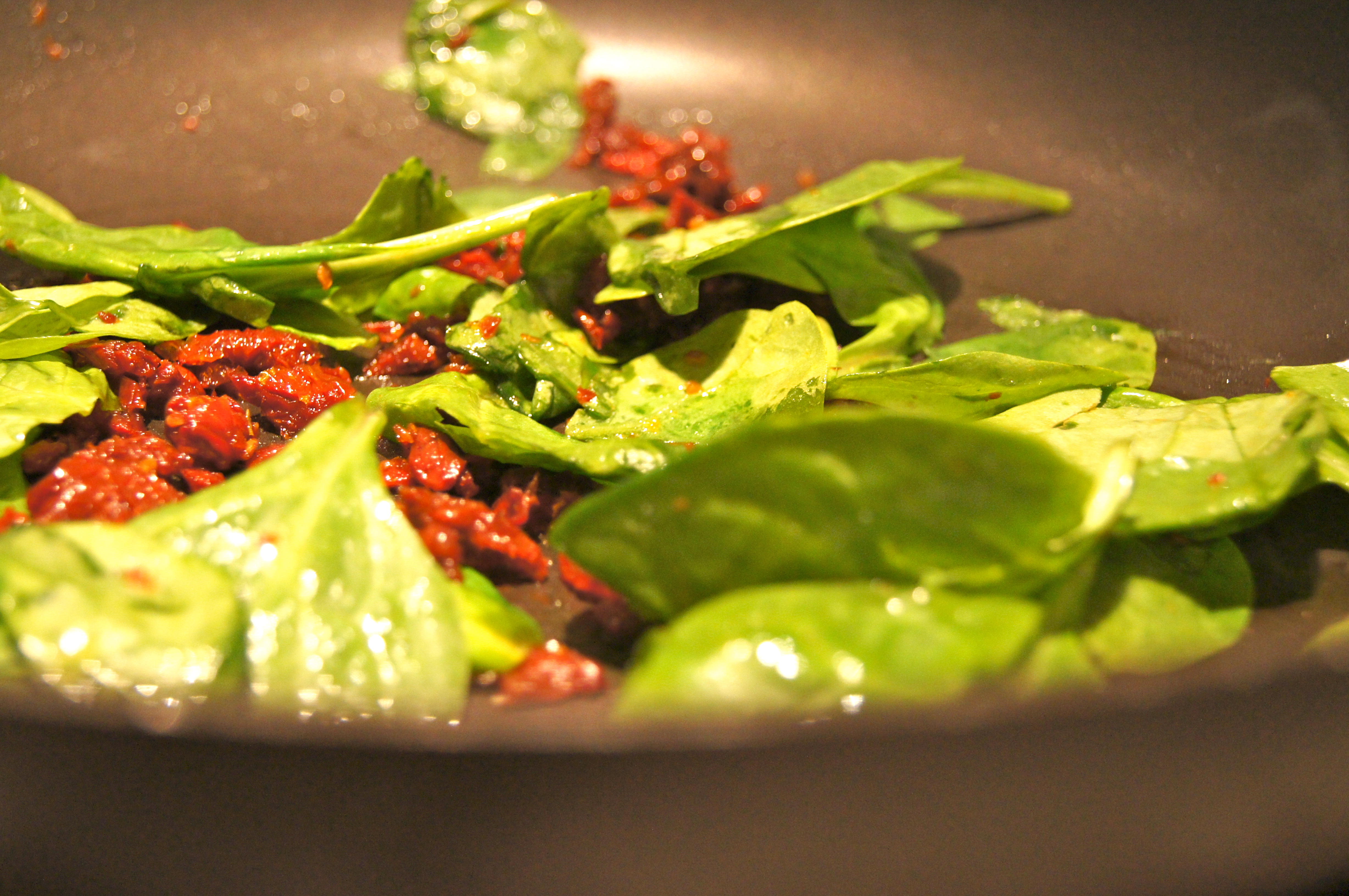Heat olive oil in a large skillet over medium heat.  Add the sun dried tomatoes and spinach and cook, stirring occasionally, until spinach is wilted down, about 3-5 minutes.  Remove from heat.  Transfer mixture to a medium bowl, add goat cheese and mix until stuffing is combined.  Place bowl in the freezer to chill while you prepare your pork.