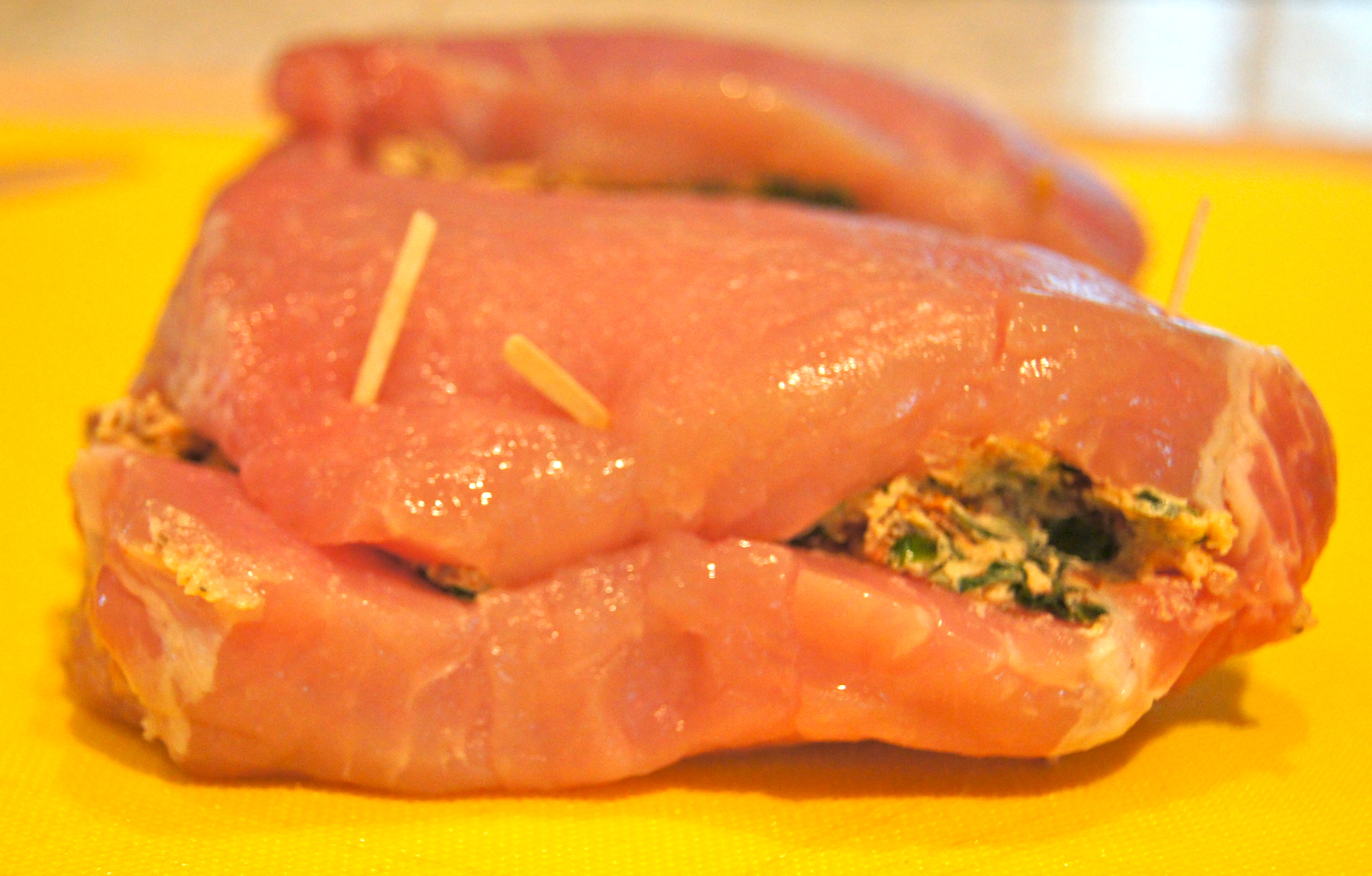 With a sharp knife, slice a large slit through the middle of each chop, slicing horizontally so that it can be opened like a book.  Remove stuffing from freezer and spoon it into the middle of each chop.  Secure each pork chop closed with a couple of toothpicks.  At this point chops can be stored in the refrigerator for up to 24 hours.