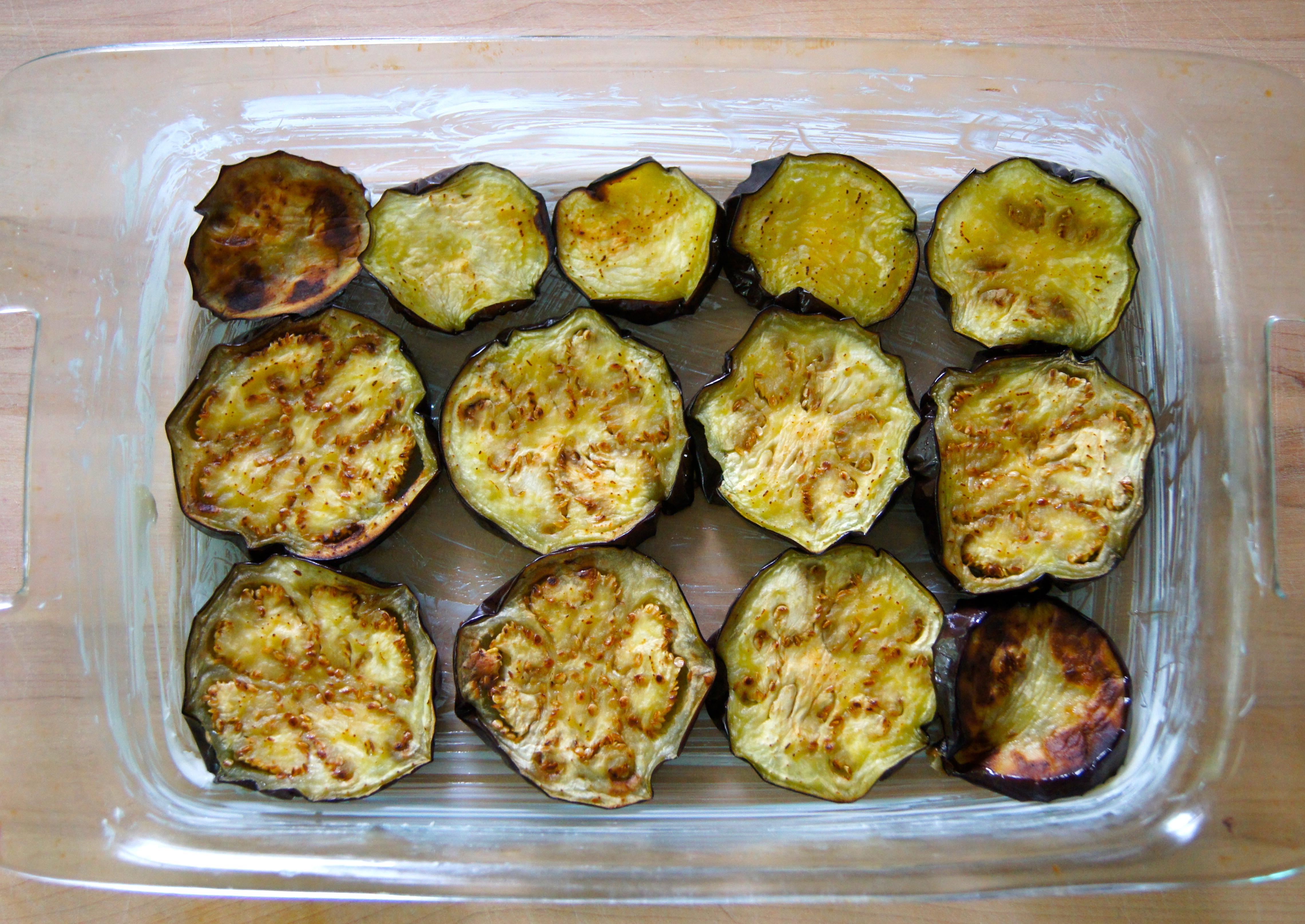 Preheat oven to 450. Brush both sides of eggplant slices with olive oil and place on a baking sheet in a single layer. Place in the oven and roast for 25 minutes, flipping halfway through, or until both sides are nicely browned. Remove from oven and cool slightly.