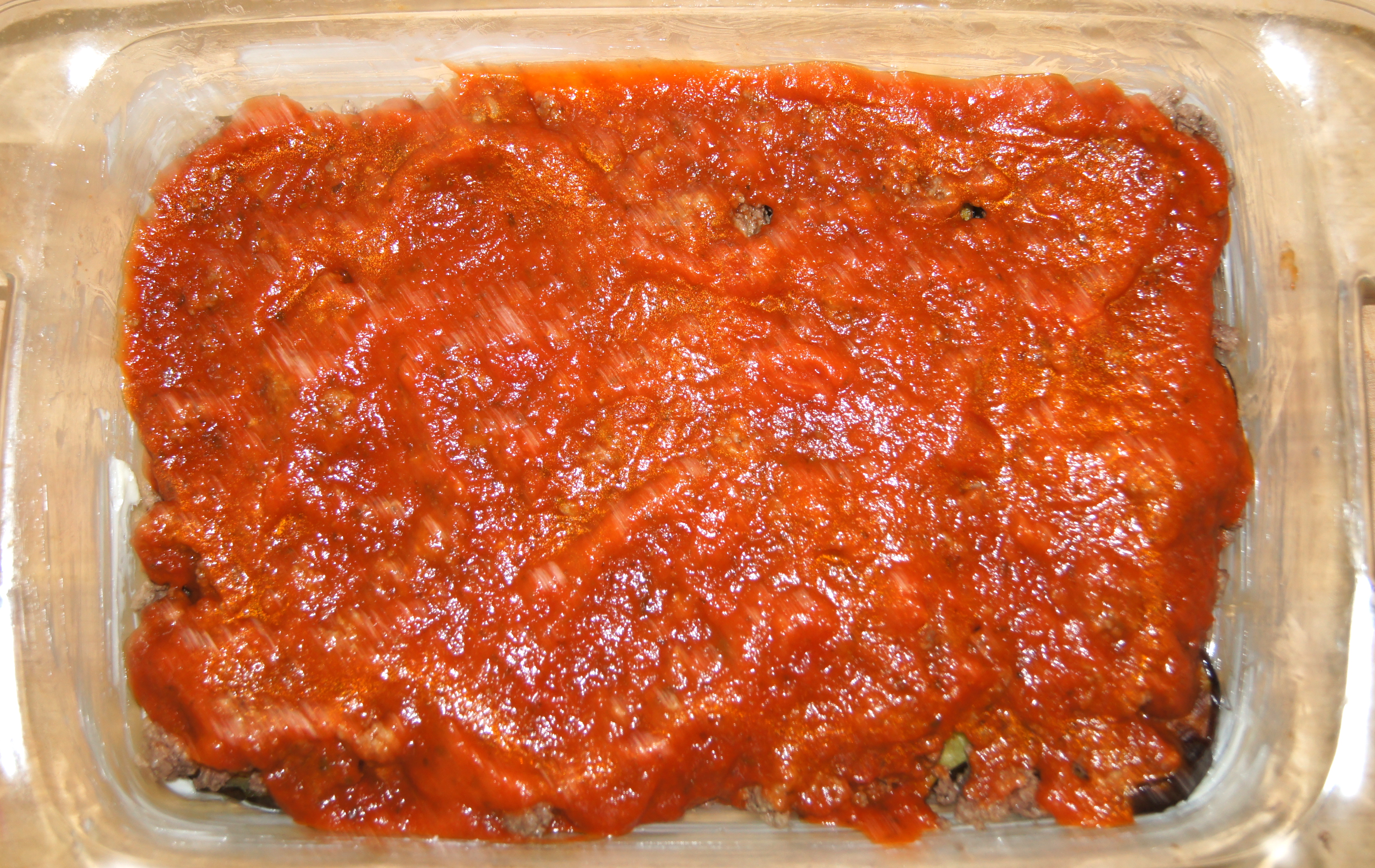 Turn the oven down to 375 and grease a 9×13 baking dish. Place the eggplant in a layer to cover the bottom of the dish…if the eggplant overlaps a bit that is just fine. Next layer the ground beef, if using and then the marinara. Last pour the parmesan cream mixture over the top and dot the top with mozzarella cubes. Place in the oven and bake, uncovered, until bubbling and the top begins to brown, about 30 minutes. Remove from oven and let sit for 5-10 minutes before serving.