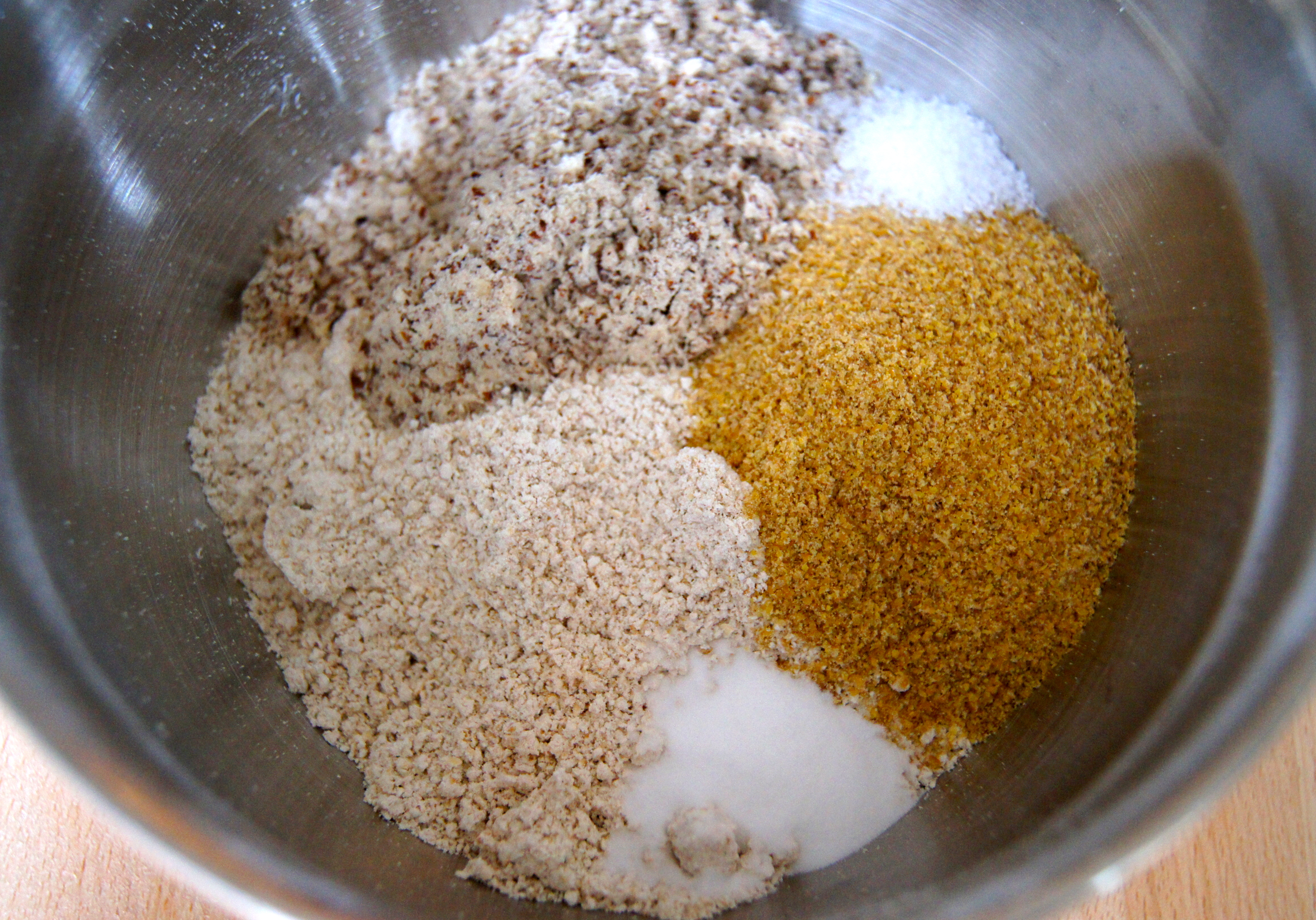 Preheat oven to 350 and grease a 9×5 inch loaf pan with butter. Place the oat flour, flax meal, almond meal, baking soda and salt in a medium bowl and whisk to combine.