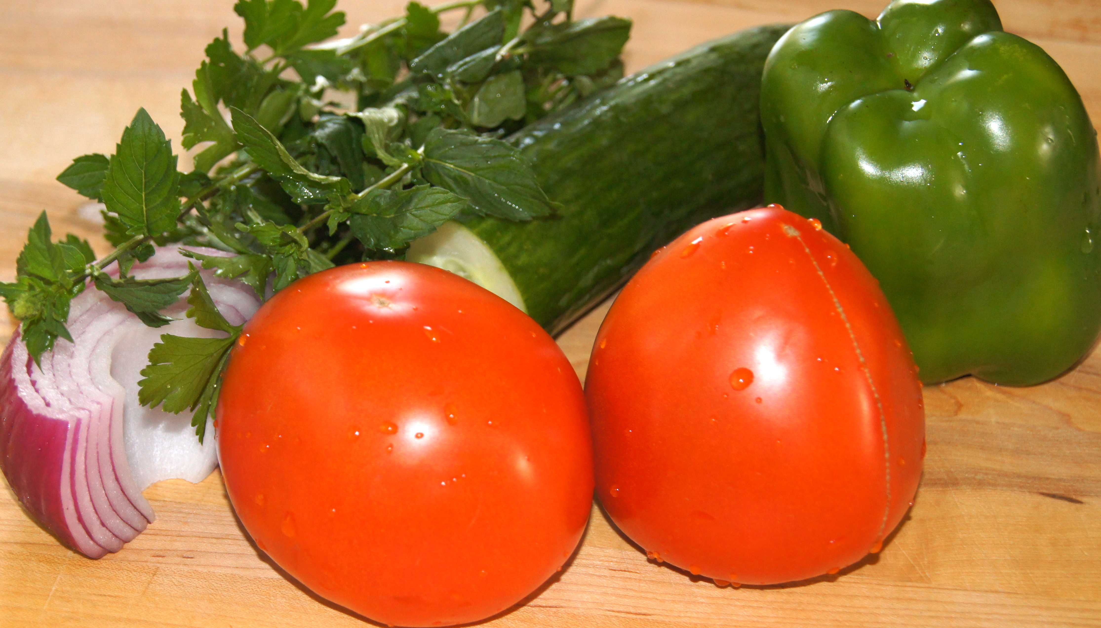 In a small bowl whisk together the lemon juice, olive oil, garlic, salt and pepper until well combined. Chop the tomatoes, cucumber and green pepper into large bite-sized pieces and place in a large bowl. Add the onion, mint and parsley and drizzle the vinaigrette over the top. Stir well to coat and season with additional salt and pepper if desired. Serves 4