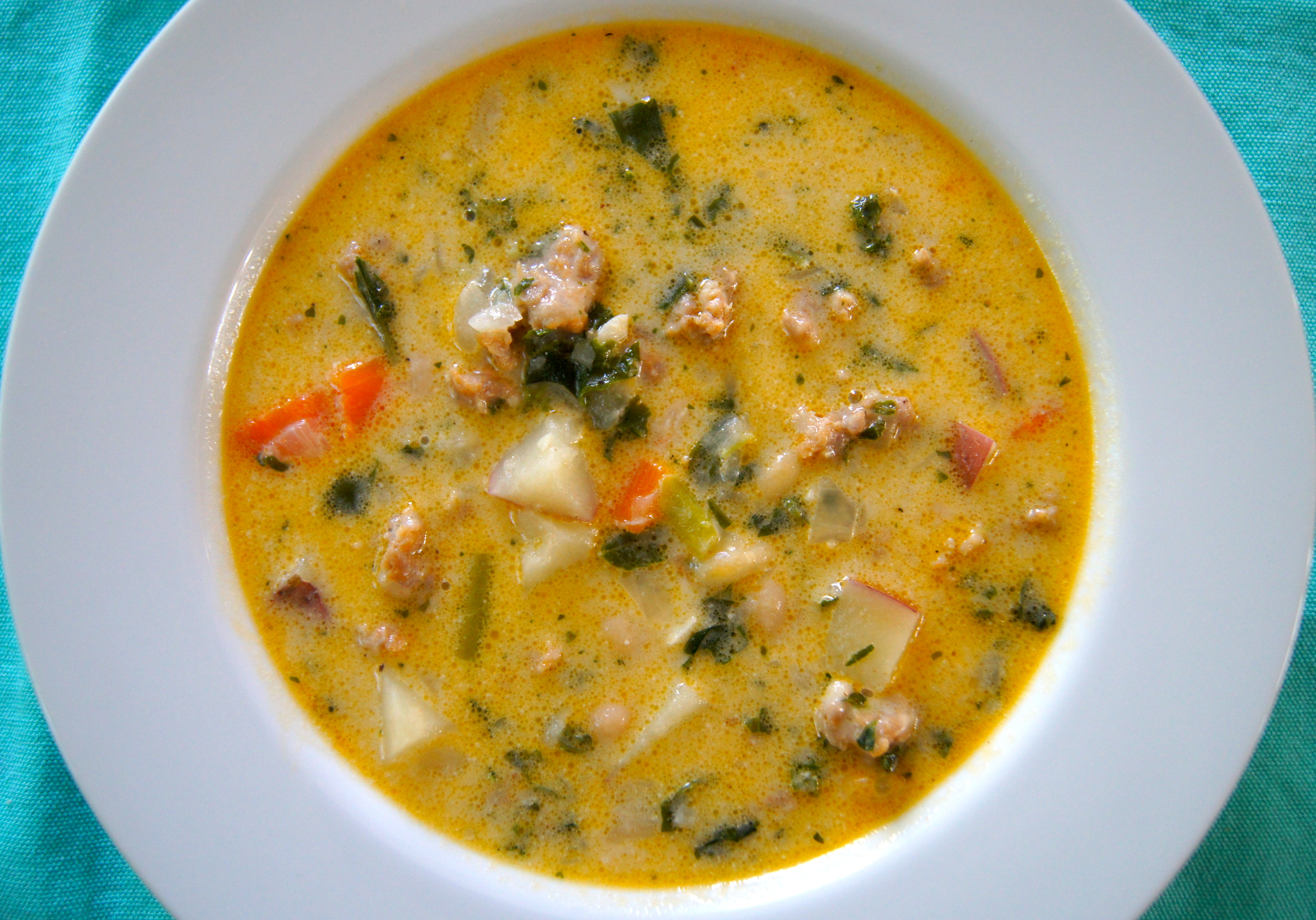 Well…it’s beginning to feel a lot like my favorite time of year. Football has begun, the air has cooled down (at least for now) and soups and stews are preparing to overtake my kitchen, ahhhh the excitement is out of control over here! This is a favorite of ours that is just perfect for this time of year because we can still utilize the fresh kale, carrots and potatoes from our local farmer. The flavors of the soup are rich and warm without making the consistency too dense or heavy. Real ingredients prepared quickly with crazy amounts of savory flavor…my kind of one pot meal.